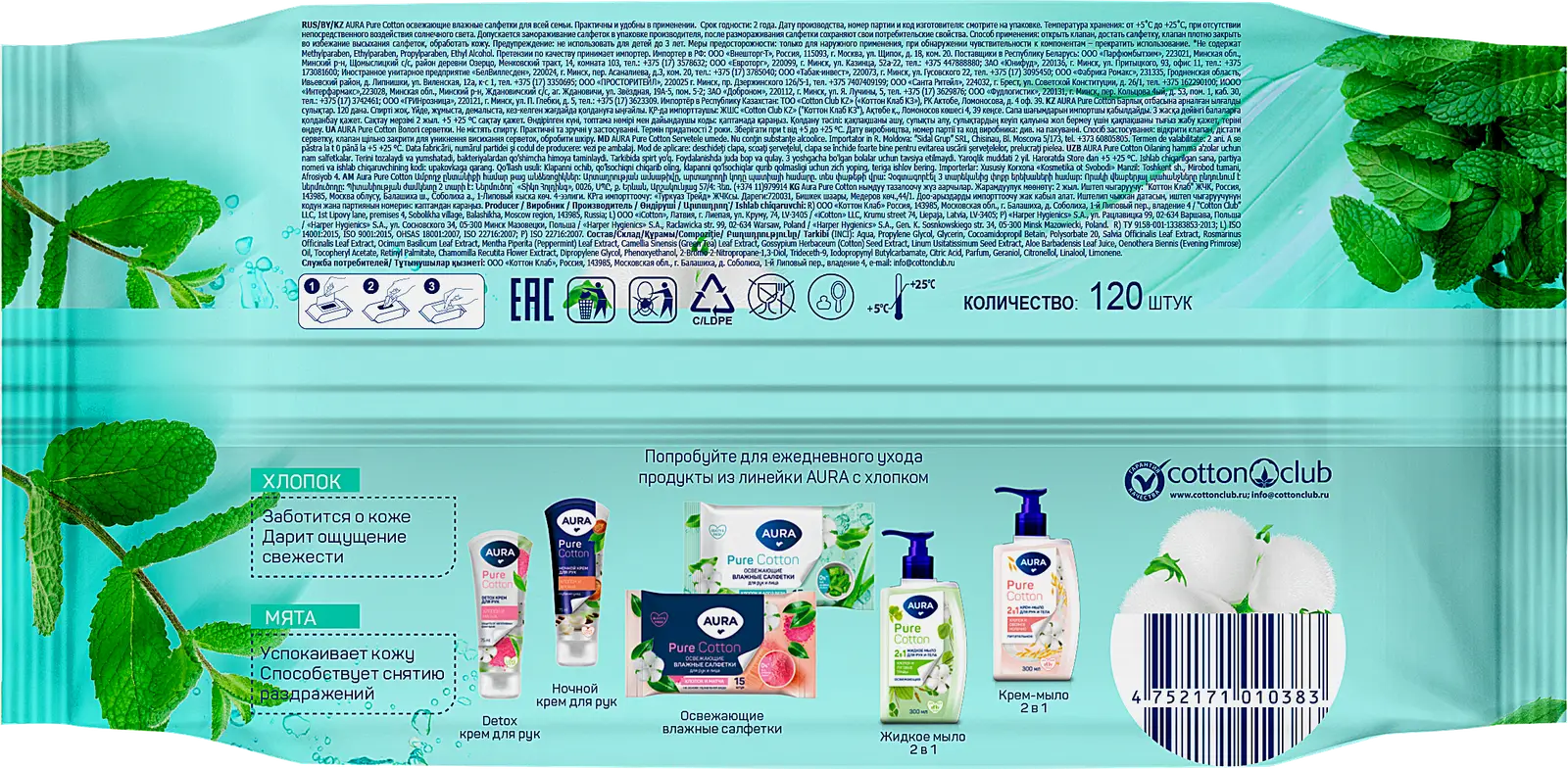 Освежающие влажные салфетки на основе очищенной воды деликатно очищают кожу рук и тела. Содержат экстракты хлопка и зелёного чая, которые тонизируют и смягчают. Не содержат спирта, парабенов и SLS. Подходят для всей семьи. Упаковка с удобной крышкой предотвращает высыхание.