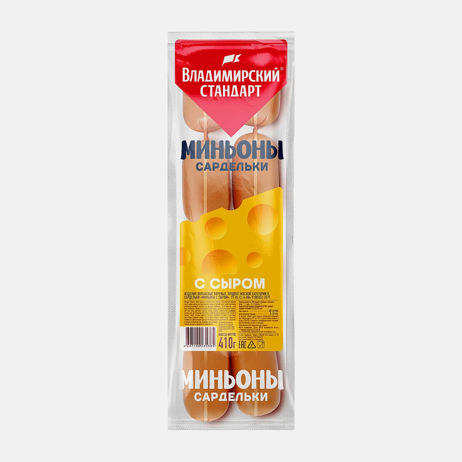 Сардельки небольшого размера с сырной начинкой изготовлены из смешанного фарша: свинина, говядина, куриное филе. Для сочности в него добавлено молоко, а вкусовые качества подчеркивают специи.