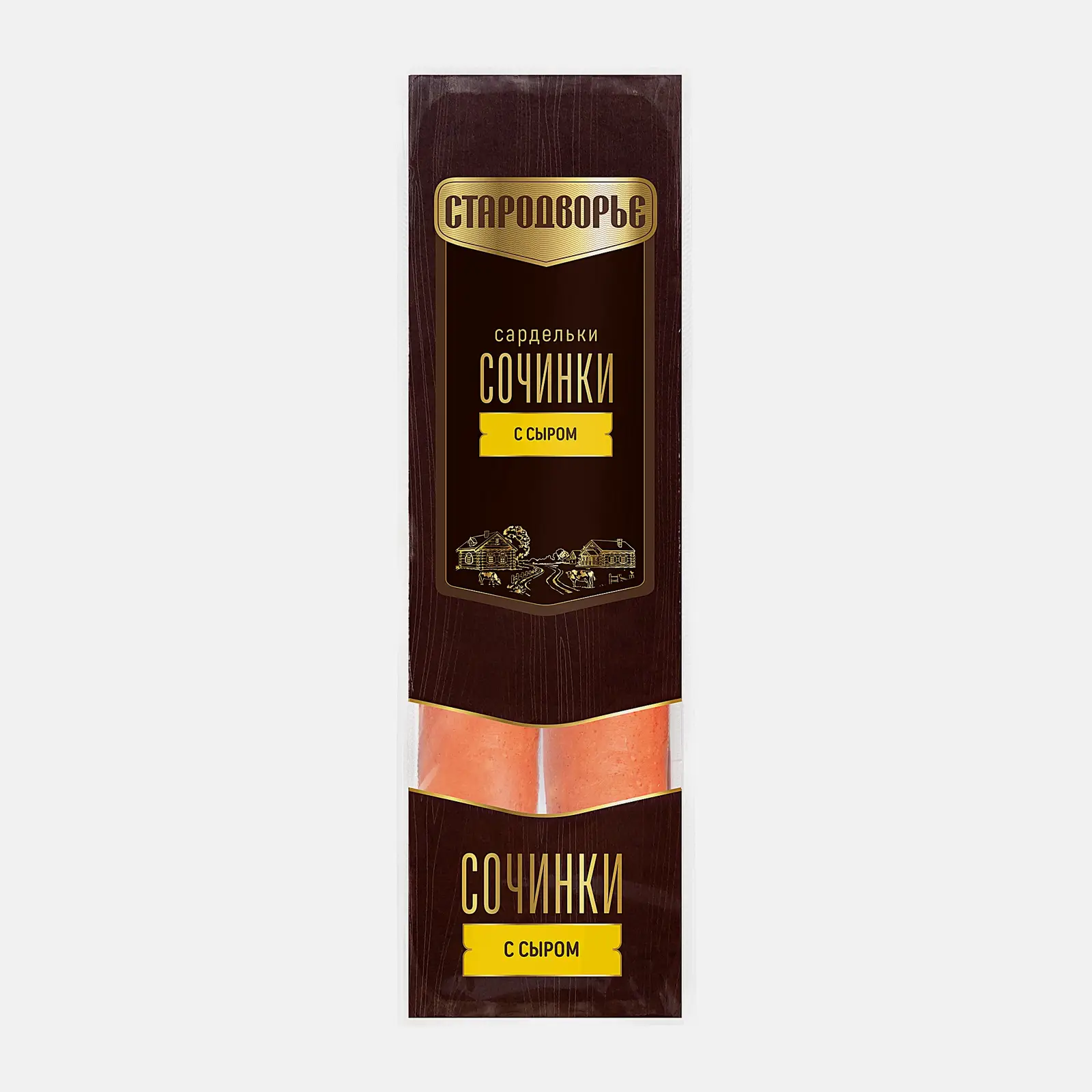 Толстенькие, уже отваренные колбаски со сливочным сыром, который аппетитно плавится по время приготовления. В основе куриное мясо, так что сардельки в меру жирные, зато очень сочные, их нужно только прогреть.