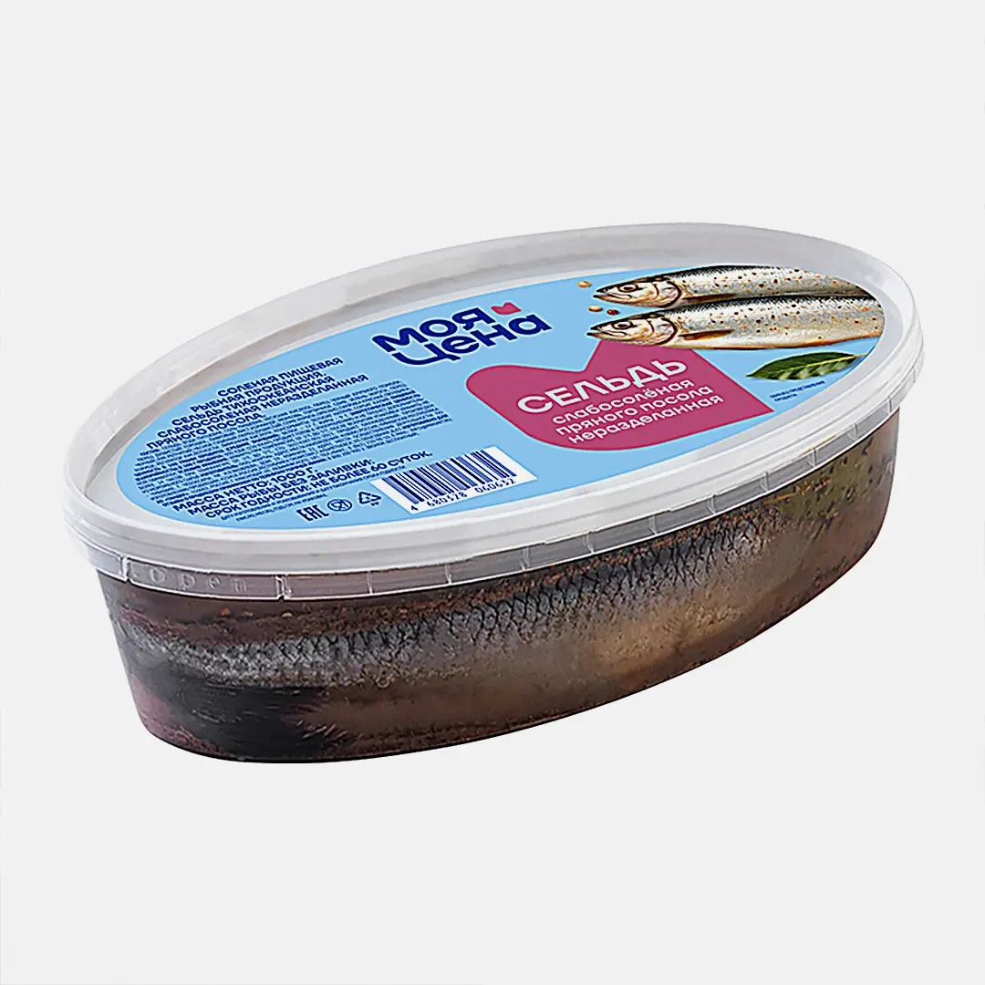 Сельдь Моя цена слабосоленая в пряной заливке неразделанная 1кг – полезный продукт по бюджетной цене. Большой упаковки хватит на дружную семью или компанию друзей, а приятный аромат пряностей быстро соберет всех за одним столом. Сельдь – одна из самых популярных рыб в мире. Каждый год рыбаками вылавливается несколько миллиардов штук. Селедка богата витаминами и минеральными веществами. Врачи утверждают, что если вы испытываете острое желание съесть эту рыбу, то ваш организм, возможно, столкнулся с дефицитом омега-3, поэтому обязательно включите селедку в свой ежедневный рацион. Она повышает уровень гемоглобина, снимает напряжение с глаз, улучшает состояние кожных покровов и даже борется с псориазом.