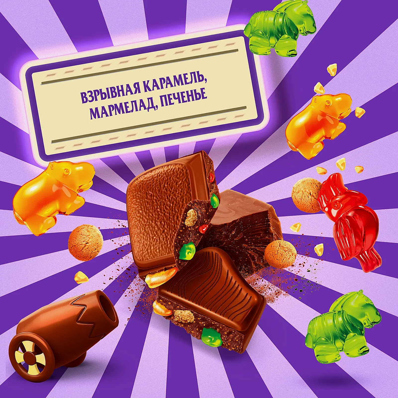 Молочный шоколад дополнен хрустящим печеньем, жевательным мармеладом и карамелью с эффектом лёгкого «взрыва». Такое сочетание делает вкус многослойным и придаёт плитке необычную текстуру.