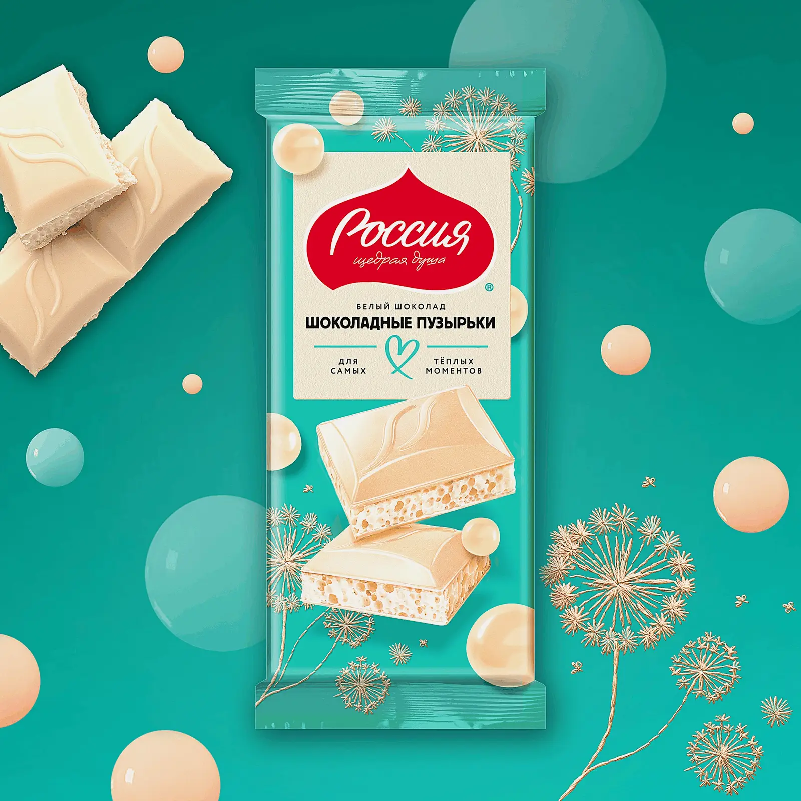 Белый пористый шоколад с воздушной текстурой и приятной сладостью. В аромате слышатся лёгкие ванильные нотки. Шоколад медленно тает во рту, создавая ощущение лопающихся пузырьков.