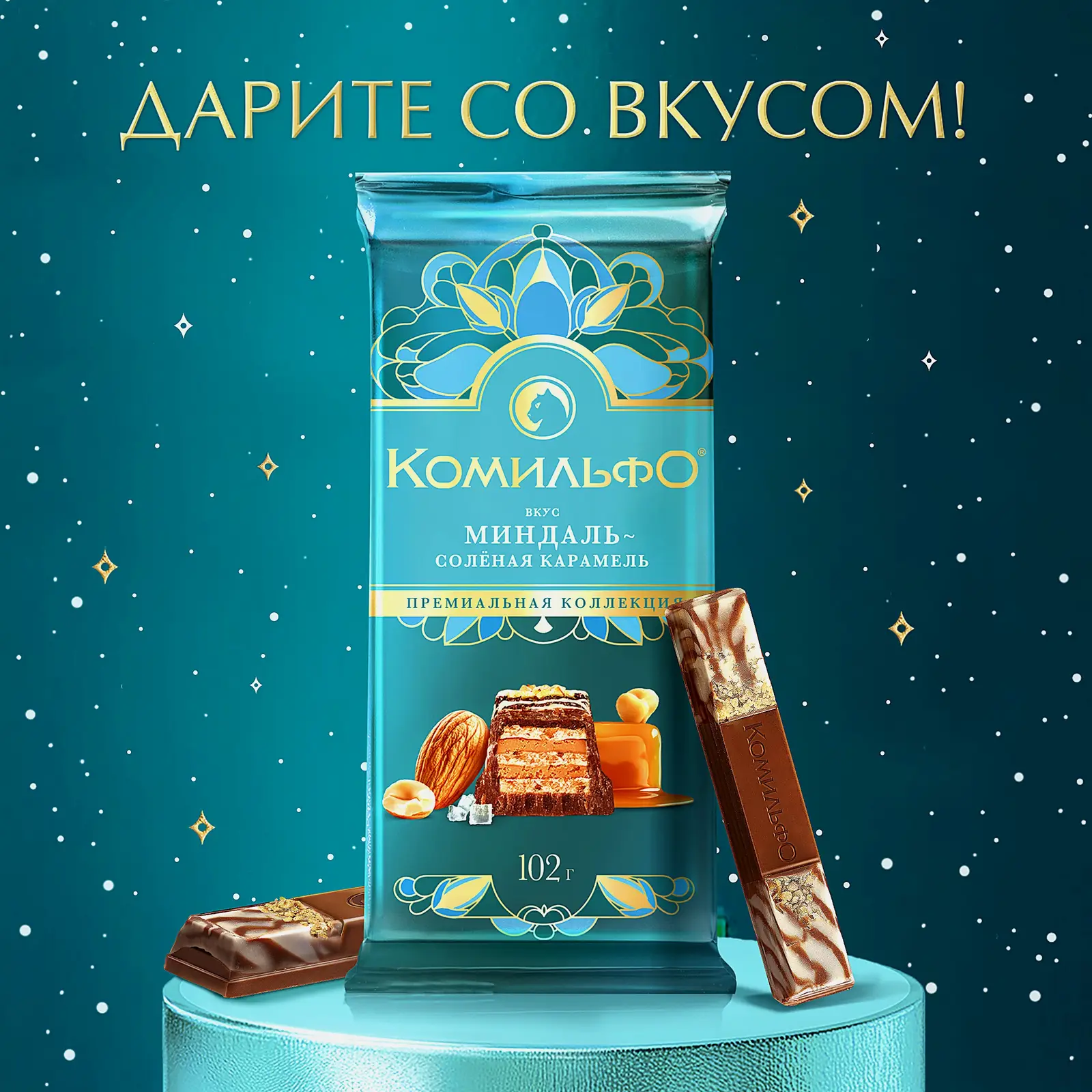 Шоколад с миндалём и солёной карамелью из премиальной коллекции. Миндаль добавляет хруст, а карамель придаёт мягкость и тягучесть.