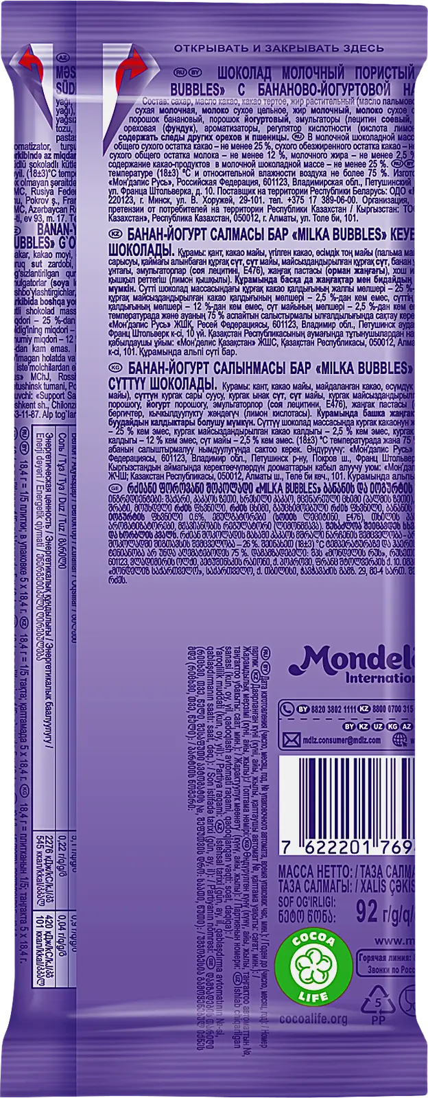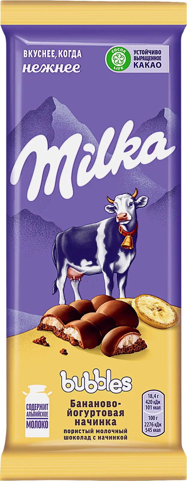 Пористый молочный шоколад с бананово-йогуртовой начинкой. Нежный шоколад с альпийским молоком тает во рту, а ароматная начинка с нотками банана и йогурта дарит яркое ощущение отдыха и лёгкости. Изготовлен на основе устойчиво выращенного какао.