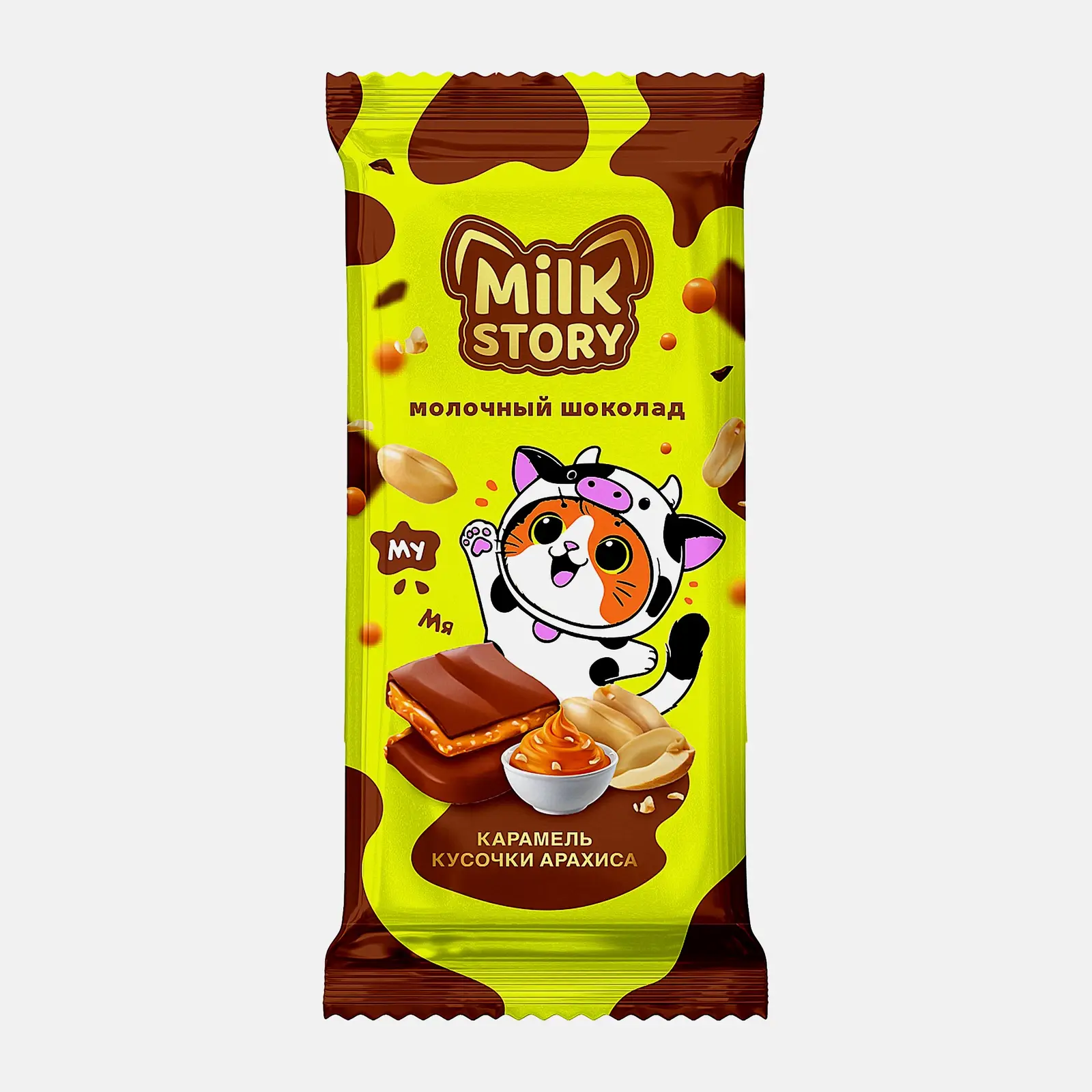 У плитки оригинальная форма — дольки нечёткие, «плывущие». Под молочным шоколадом — начинка ирисочного цвета и кремово-пастообразной консистенции. Она немного напоминает варёную сгущёнку с привкусом карамели и арахисовой пасты. Жареный арахис тонко перемолот.