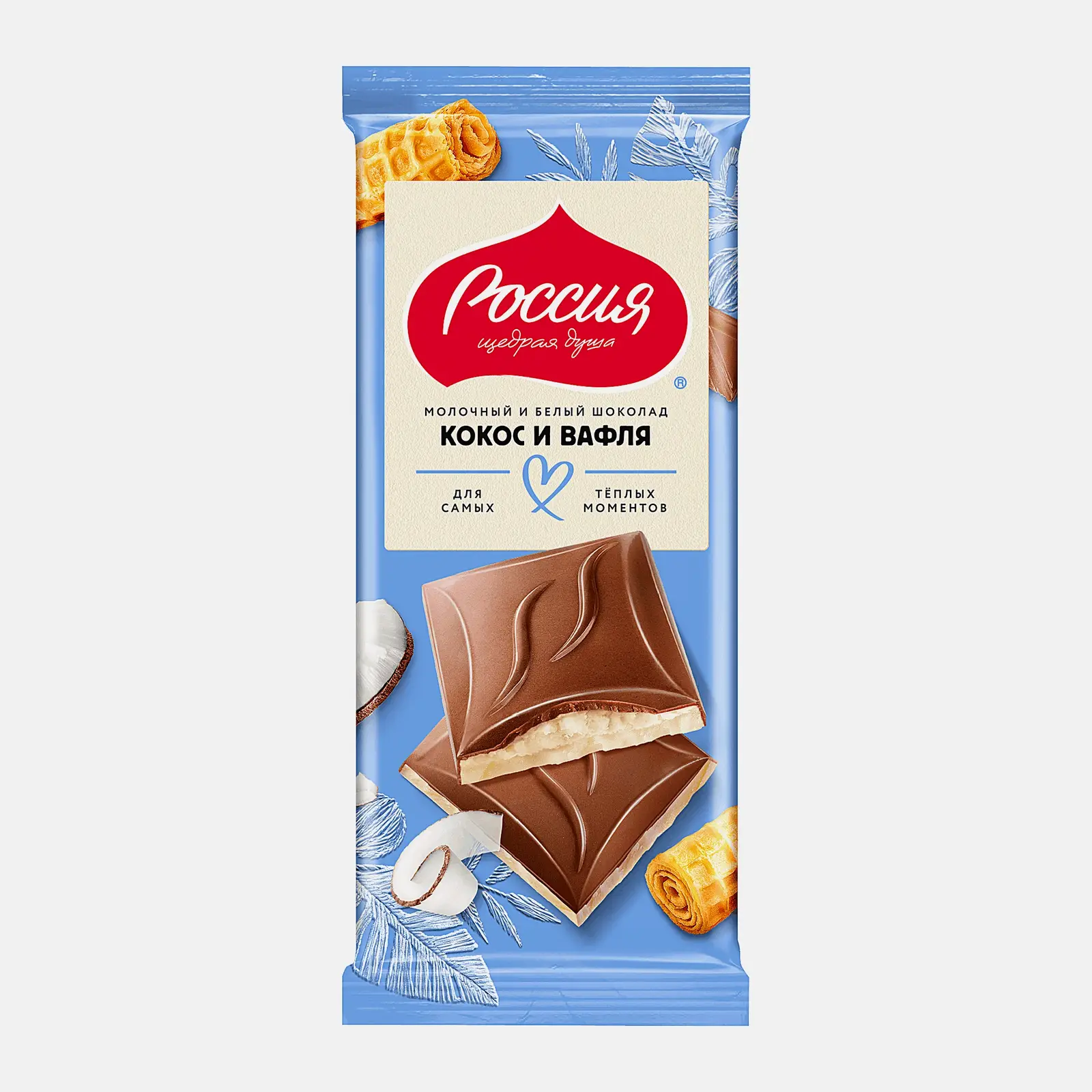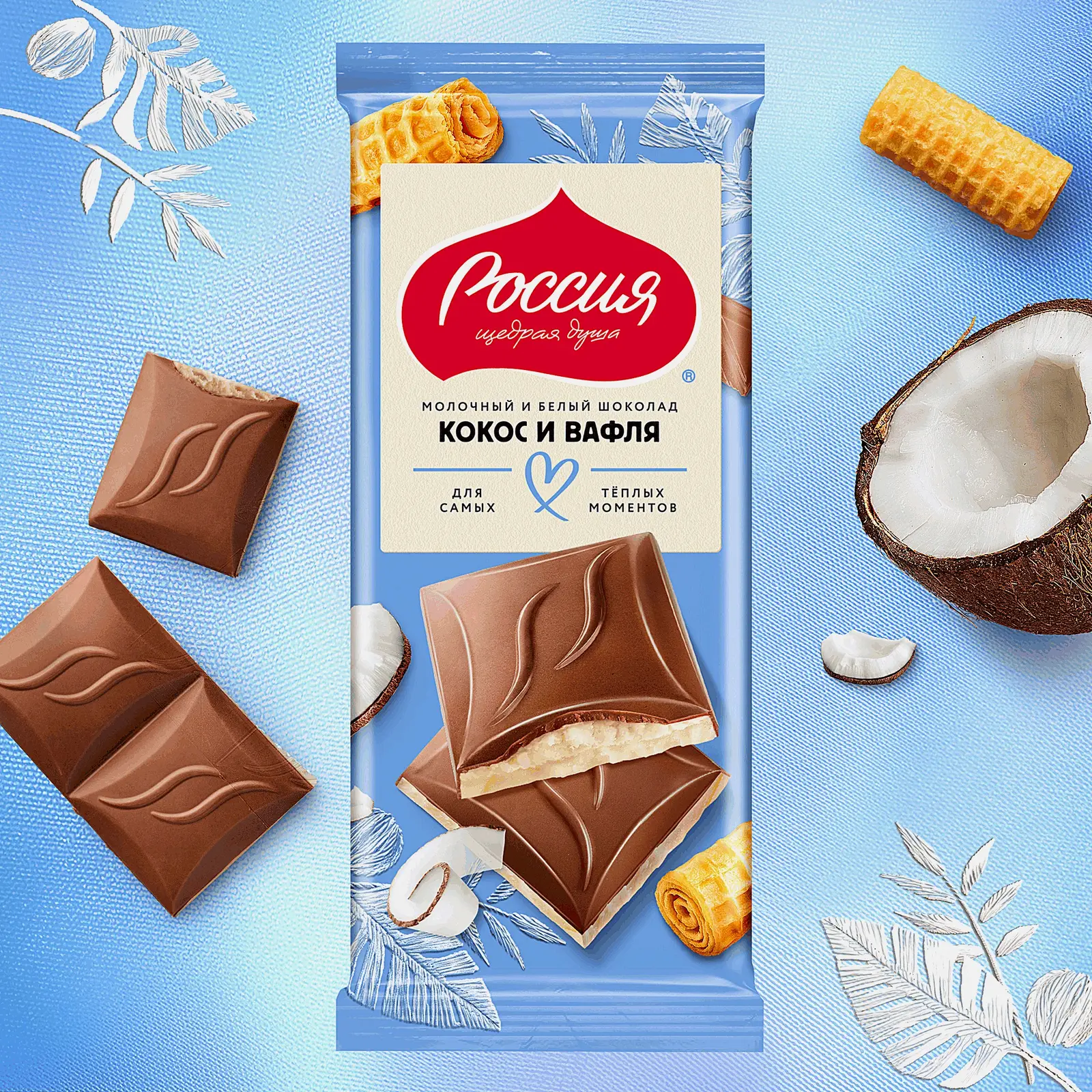 Шоколадная плитка с кокосовой начинкой и вафлей в оригинальном сочетании молочного и белого шоколада. Внутри — нежный крем с кокосовой стружкой и тонкий слой хрустящей вафли.