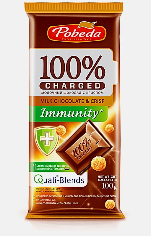 Шоколад Победа Вкуса Immunity молочный с криспом 100г отличается полезными свойствами: восполняет недостатки витаминов и микроэлементов. Обладает нежным вкусом с хрустящим наполнителем. Продукт понравится сладкоежкам любого возраста. Употреблять можно в сочетании с кружкой горячего чая, кофе, какао или с прохладными напитками. Вкусно сочетать с орехами, фруктами или печеньем. Может стать ингредиентом для приготовления различных десертов: брауни, кексов или кремов. Лакомство подарит хорошее настроение и заряд яркими эмоциями.