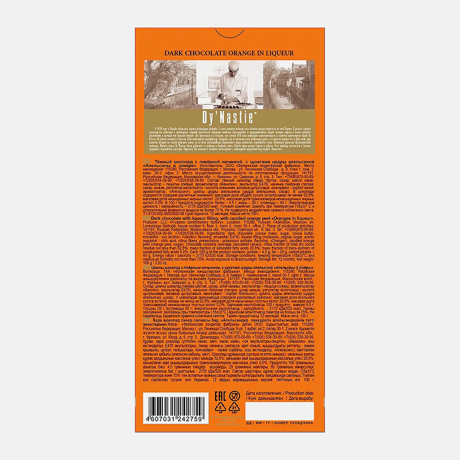 Тёмный шоколад с начинкой из апельсинов в ликёре. Яркий цитрусовый вкус с изысканными ликёрными нотами дополняет насыщенную шоколадную основу, создавая утончённое сочетание.