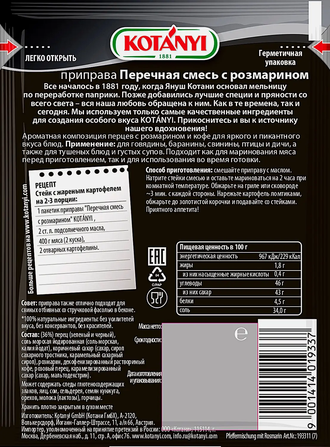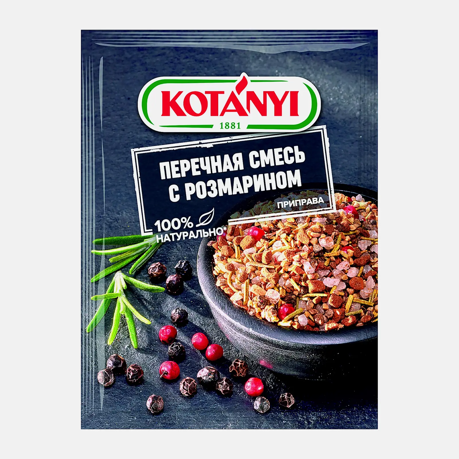 Смесь перечная Kotanyi с розмарином 20г — универсальная приправа, которую можно использовать для самых разных блюд из мяса и птицы, но лучше всего она сыграет в паре с говядиной, свининой или бараниной. Прекрасным решением будет натереть этой приправой ростбиф, карбонад или баранью лопатку часа за 1,5—2 перед запеканием. Основу этой смеси составляют дроблёные горошины чёрного и зелёного перца. Розмарин не доминирует, но добавляет отчётливую душистую ноту. Кофе в составе приправы придаёт мясу потрясающий аромат дымка. Этот эффект усиливает коричневый сахар, который к тому же дарит мясу карамельную корочку.