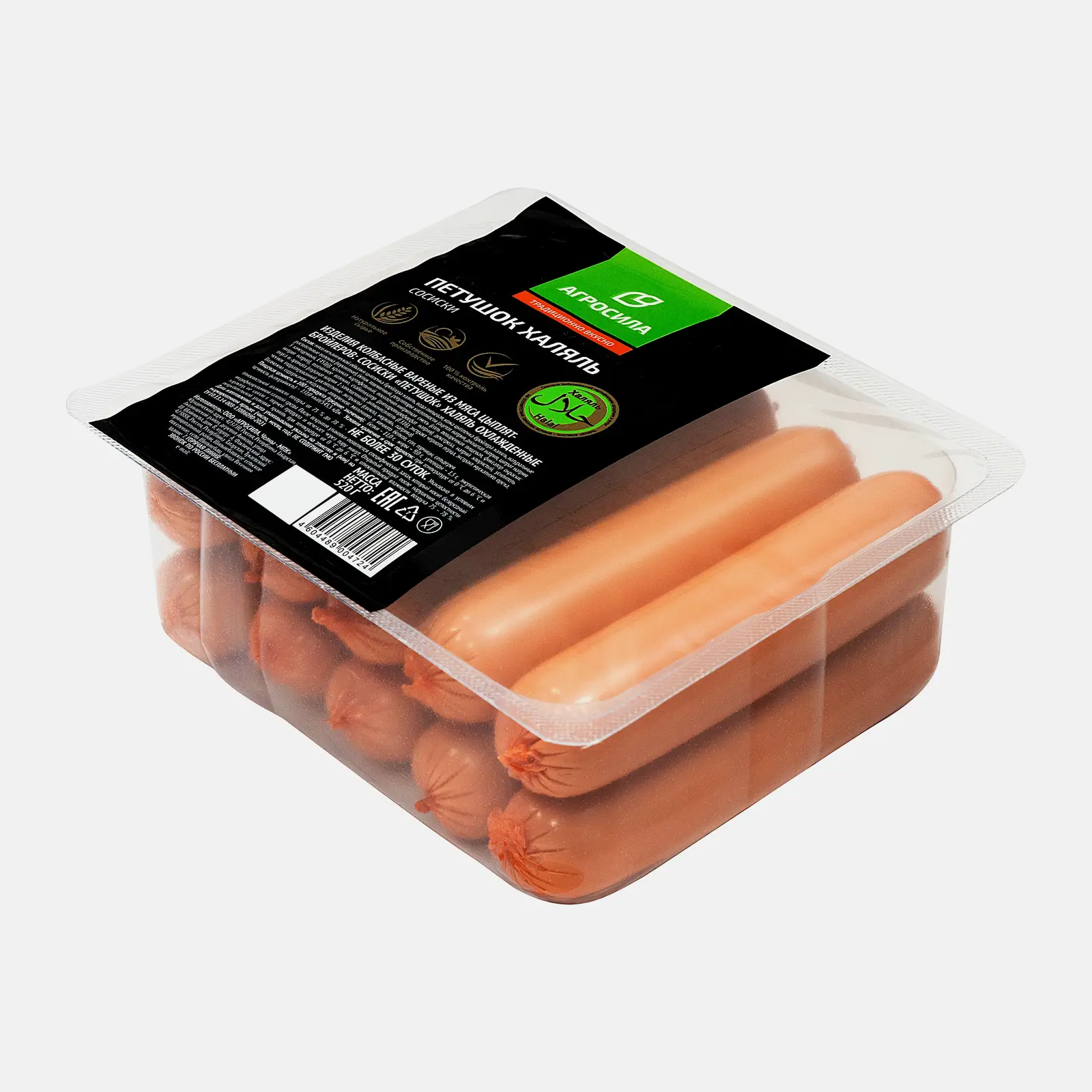 Сосиски Челны-Бройлер Петушок Халяль 520г приготовлены из мяса цыпленка-бройлера механической обвалки. Они имеют хорошо сбалансированный вкус, благодаря добавлению специй и аромат, который вызывает аппетит. В разрезе мясной продукт розовый на цвет без посторонних вкраплений. При любом варианте термической обработки они хорошо сохраняют форму и не вздуваются. Вареный мясной продукт достаточно плотный, но при этом нежный. Его нежный вкус хорошо сочетается с различными соусами, горчицей, кетчупом. Мясное блюдо с гарниром в виде картофеля, крупы или макарон надолго утоляет чувство голода. Каждая сосиска находится в пленочной упаковке, весь комплект — в модифицированной атмосфере, которая позволяет сохранять свежесть продукта. Хранится он при температуре от 0°C до +6°C в течение 30 суток.