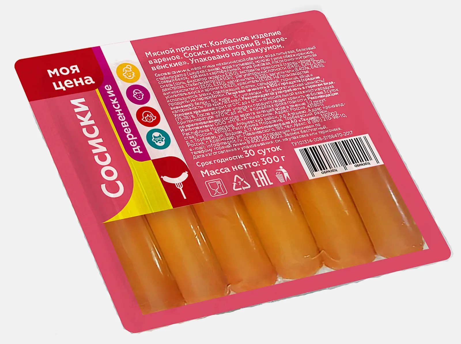 Сосиски Моя Цена 300г — это мясосодержащий продукт категории В. То есть, согласно ГОСТу, доля мяса в таких сосисках должна составлять 40–60%. Сосиски «Деревенские» изготовлены на основе свинины и куриного мяса с добавлением соевого белка, сухого молока, крахмала, пряностей, ароматизаторов, консервантов и других дополнительных ингредиентов. Цена продукта вполне отвечает его качеству. Сосиски выручат после напряжённого рабочего дня: их нужно варить не более 1–2 минут, гарнировать макаронами и кетчупом — сытный ужин готов. Хороший способ приготовления таких сосисок — нарезать их кругляшами и потушить в томатном соусе с чесночком.