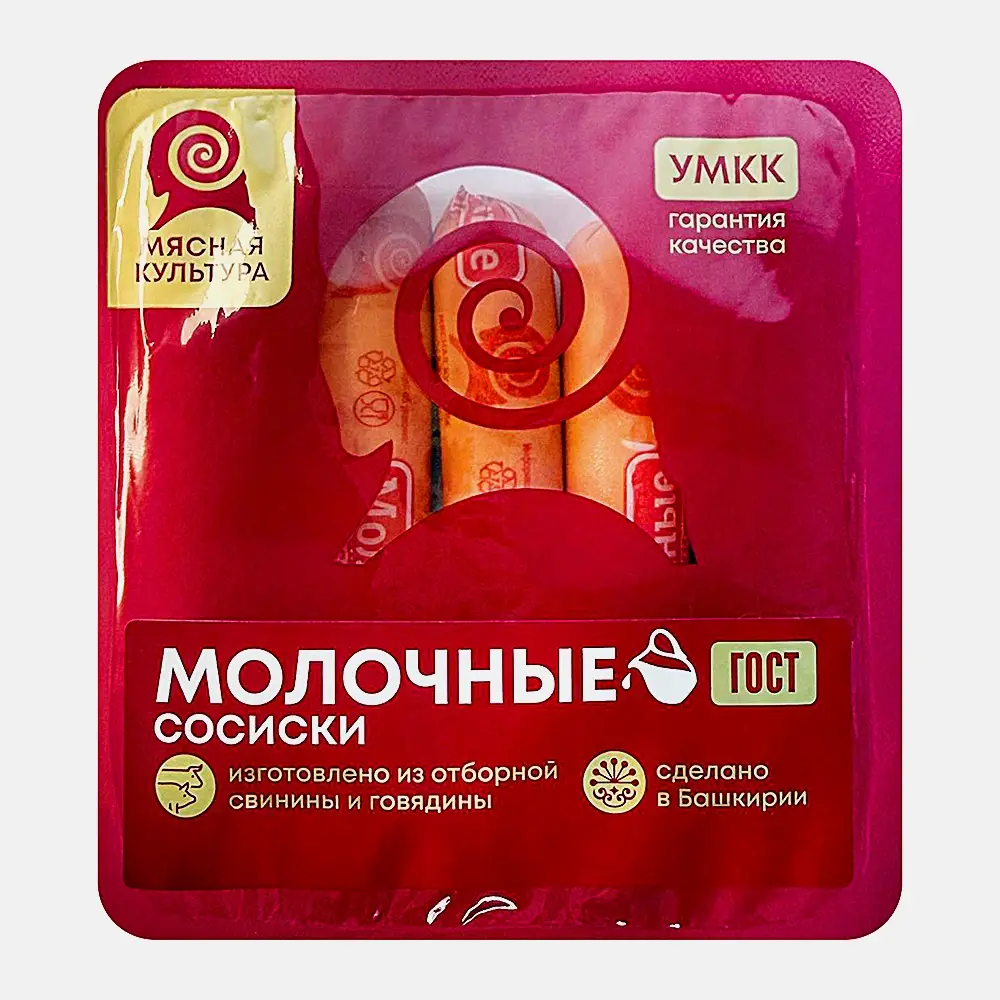 Сосиски Уфимский МКК Молочные ГОСТ 255г — ароматные и сочные колбасные изделия из мяса говядины, свинины и обезжиренного молока. Для насыщенного аромата добавлена смесь пряностей в виде душистого перца, мускатного ореха. Сосиски хорошо сочетаются с любым гарниром: картофельным пюре, спагетти, рисом, гречневой кашей. Их вкус раскрывается в сочетании с домашней выпечкой, квашеной капустой, плавленым сыром. Источник железа, йода, кальция и магния улучшает деятельность щитовидной железы, органов кроветворения, укрепляет кости, мышечную ткань. Регулярное употребление сосисок в умеренном количестве стимулирует работу нервной системы, улучшает память. Они расфасованы в удобные для хранения и использования упаковки. Срок их годности составляет 20 суток при температуре 0-6°С.