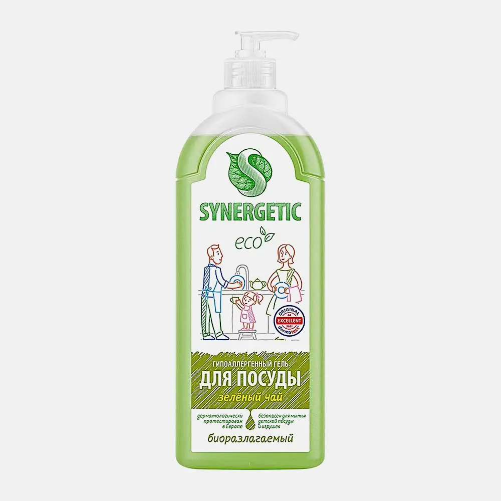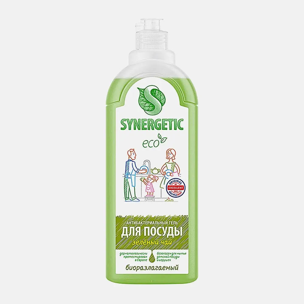 Биоразлагаемый антибактериальный гель «Зелёный Чай» для мытья посуды и детских игрушек хорошо пенится и полностью смывается водой. Он устраняет загрязнения, жир и запахи даже в холодной воде. Безопасный состав с глицерином не вызывает раздражения и подходит для людей с чувствительной кожей рук.