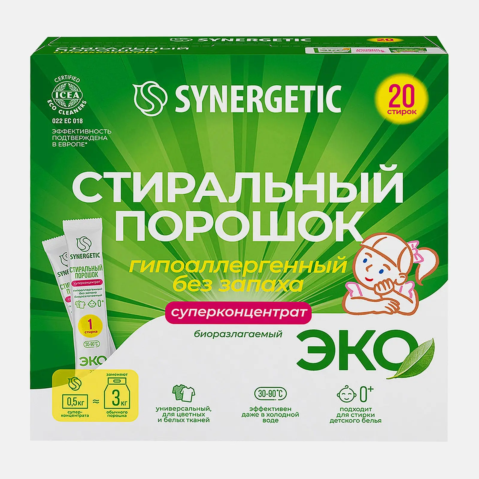 Биоразлагаемый гипоаллергенный стиральный порошок на основе безопасных растительных компонентов для стирки детского белья и одежды людей с чувствительной кожей. Подходит для белых и цветных, натуральных и синтетических тканей, ручной и машинной стирки. Полностью выполаскивается и сохраняет цвет изделий. Концентрат в стиках на 20 стирок.