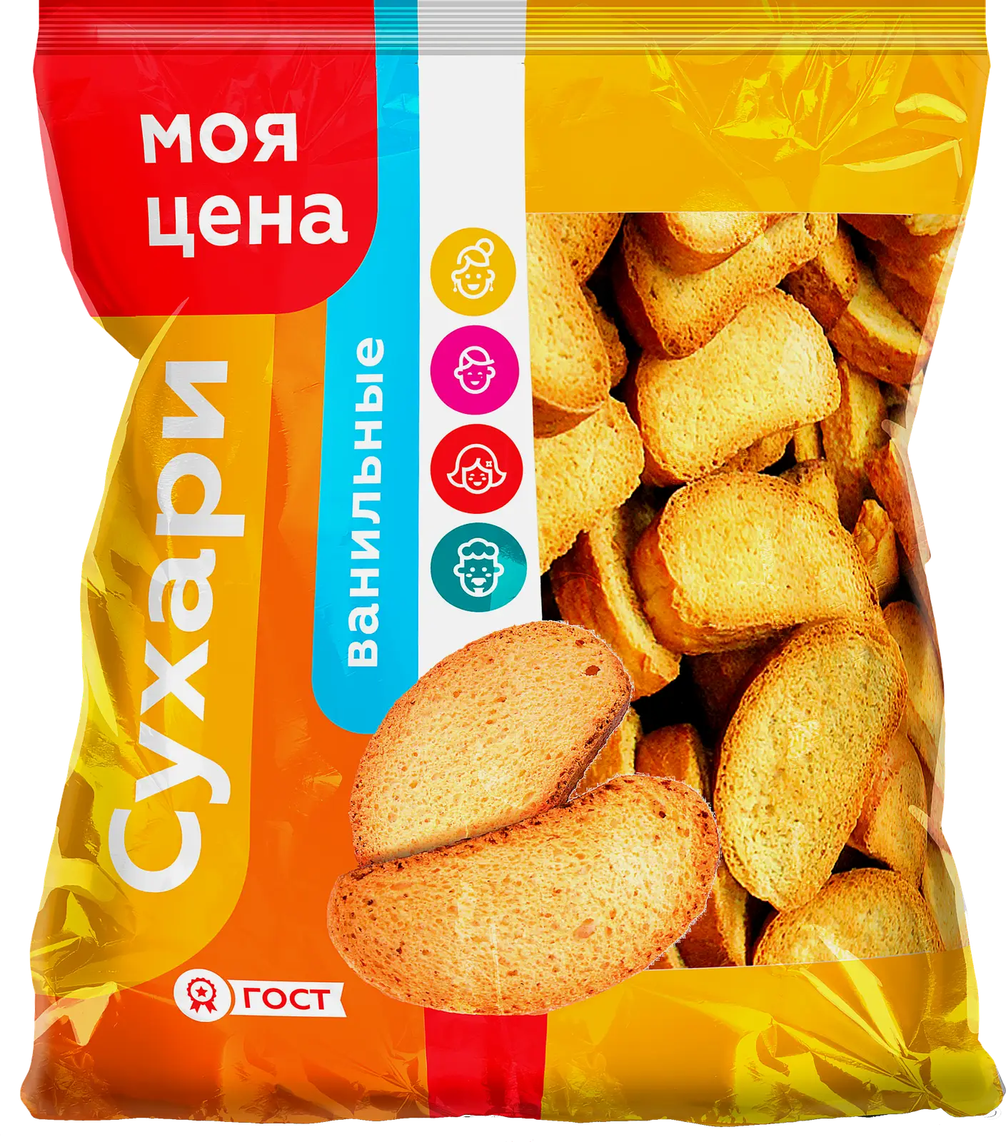 Золотистые аппетитные сухари с лёгким ароматом ванили. Хрустящая текстура и сбалансированный сладкий вкус делают их отличным дополнением к чаю, кофе или молоку.
