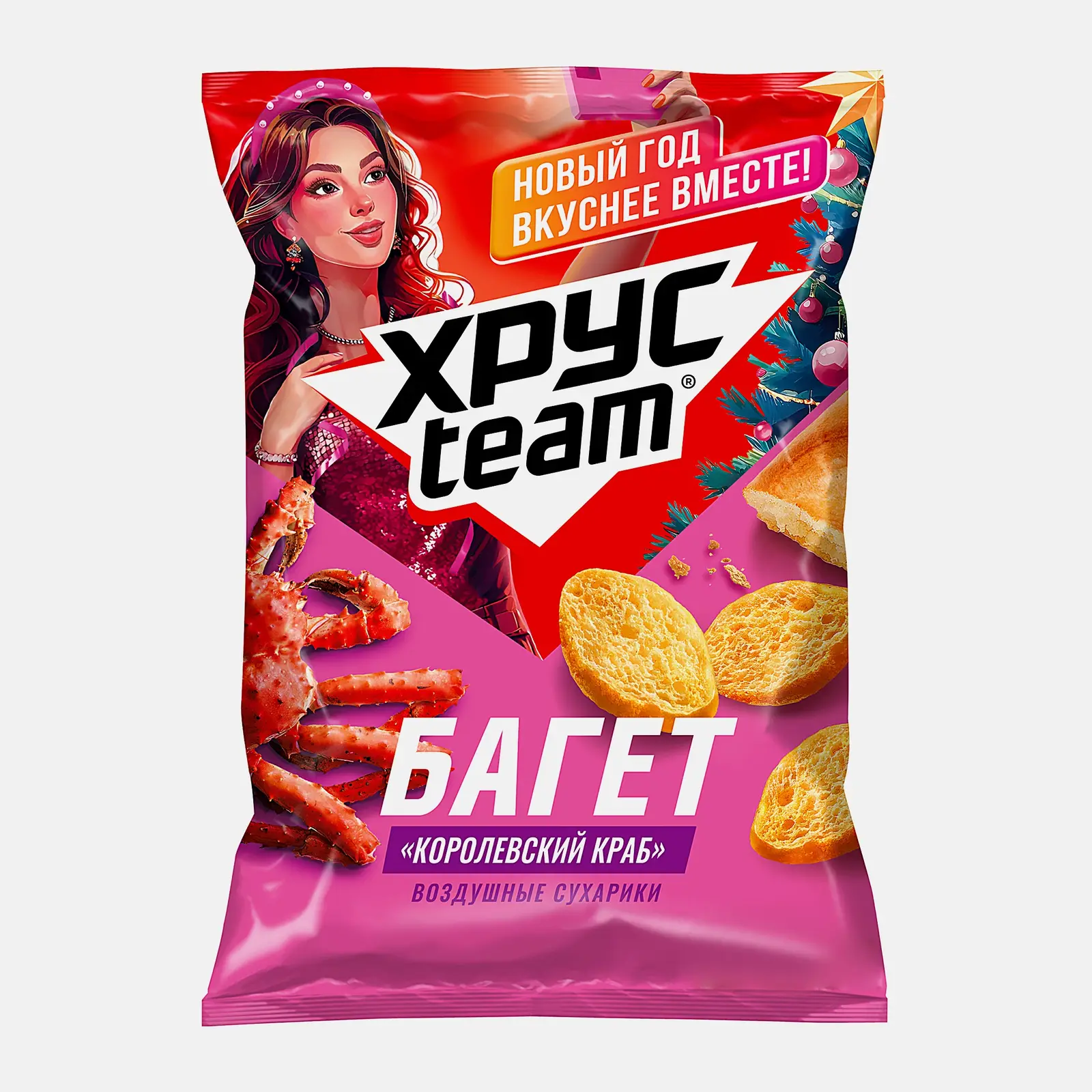 Воздушные пшеничные сухарики в форме ломтиков крошечного багета мягко хрустят и рассыпаются во рту. Букет ароматических веществ создаёт тот самый «крабовый» вкус со сливочно-томатными оттенками. Душистые травы делают вкус богаче и выразительнее.
