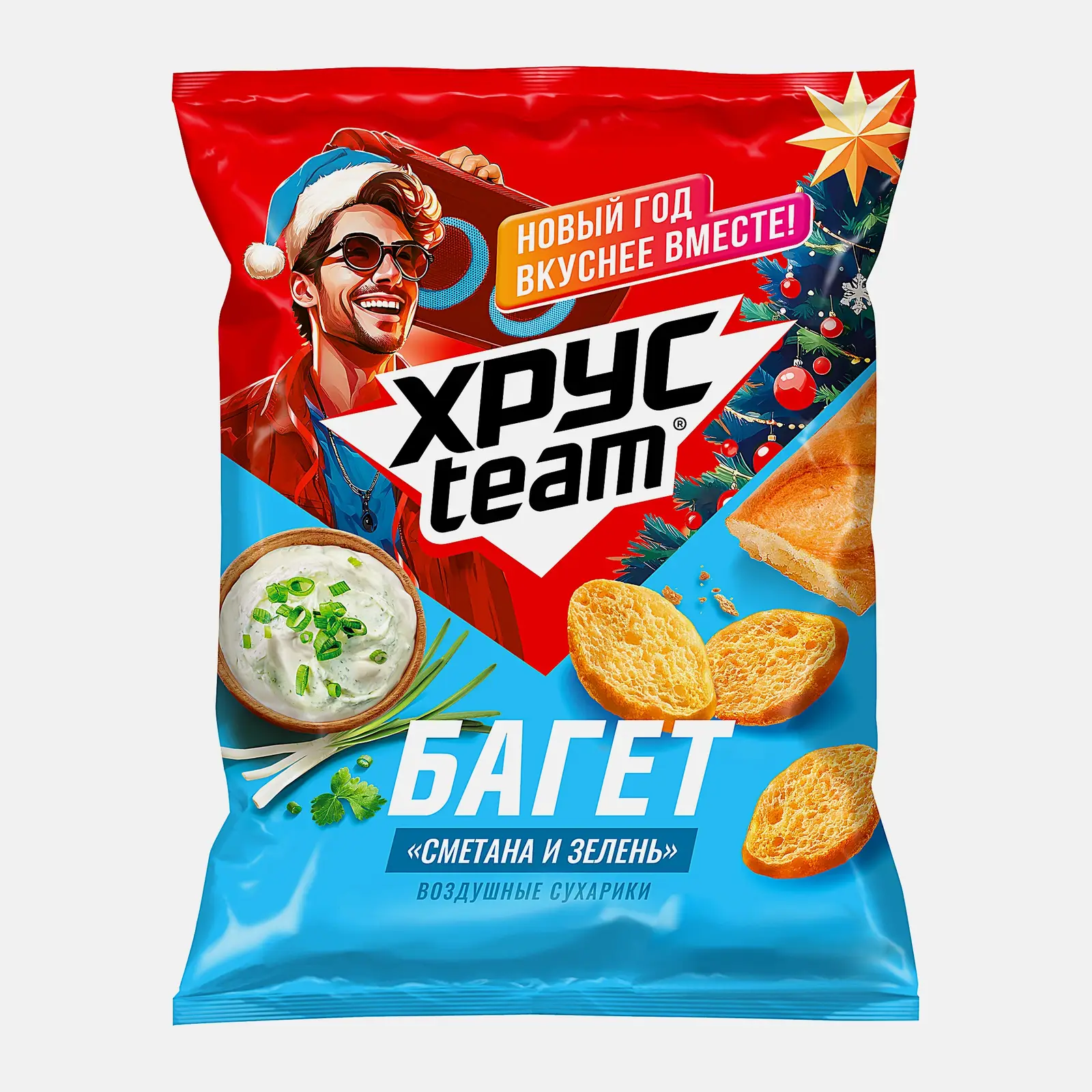 Воздушные пшеничные сухарики в форме ломтиков крошечного багета мягко хрустят, рассыпаются и сразу тают во рту, оставляя на языке пряный «сметанный» вкус. За сметану отвечает порошок молочной сыворотки. За ароматную зелень — порошок из лука, чеснока и петрушки.