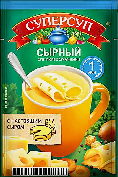 Суп-пюре Суперсуп Сырный суп с сухариками 19г не требует варки. Достаточно залить его кипятком или наваристым бульоном. Готовый продукт хорошо сочетается со свежими овощами, лавашем, мякишем хлеба. Обед быстрого приготовления освободит от длительной готовки на кухне. Он отличается густой консистенцией, насыщенным вкусом с нотами сыра и пряных специй. Он дополняется хрустящими сухариками, которые сохраняют форму после термической обработки. Натуральные ингредиенты без ГМО способствуют насыщению организма, восполняет энергию.Суп-пюре поставляется в небольших по размеру пакетах, которые можно брать с собой в путешествия или офис. Срок годности их содержимого составляет 12 месяцев при температуре 10-25°С.