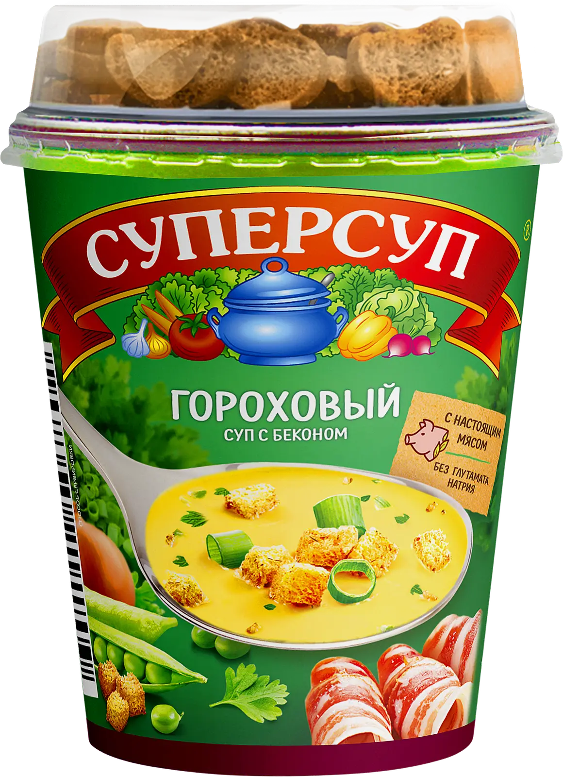 Суп Суперсуп Гороховый с беконом + гренки 45г — продукт быстрого приготовления, который экономит время у плиты. В нем ощущается вкус гороха с мелкими кусочками бекона, которые дополняют остальные ингредиенты (картофельные хлопья, сушеные овощи, зелень, экстракт перца и куркума). В супе содержится высокий процент белков, поэтому обед быстро насыщает организм питательными компонентами, утоляет голод. Он способствует процессу кровообращения, повышает тонус, устраняет спазмы сосудов. При добавлении наваристого бульона улучшается работа желудочно-кишечного тракта.Продукт поставляется в пластиковом стакане с крышкой, упрощающей приготовление блюда. Срок его годности достигает года при температуре 0-20°С.