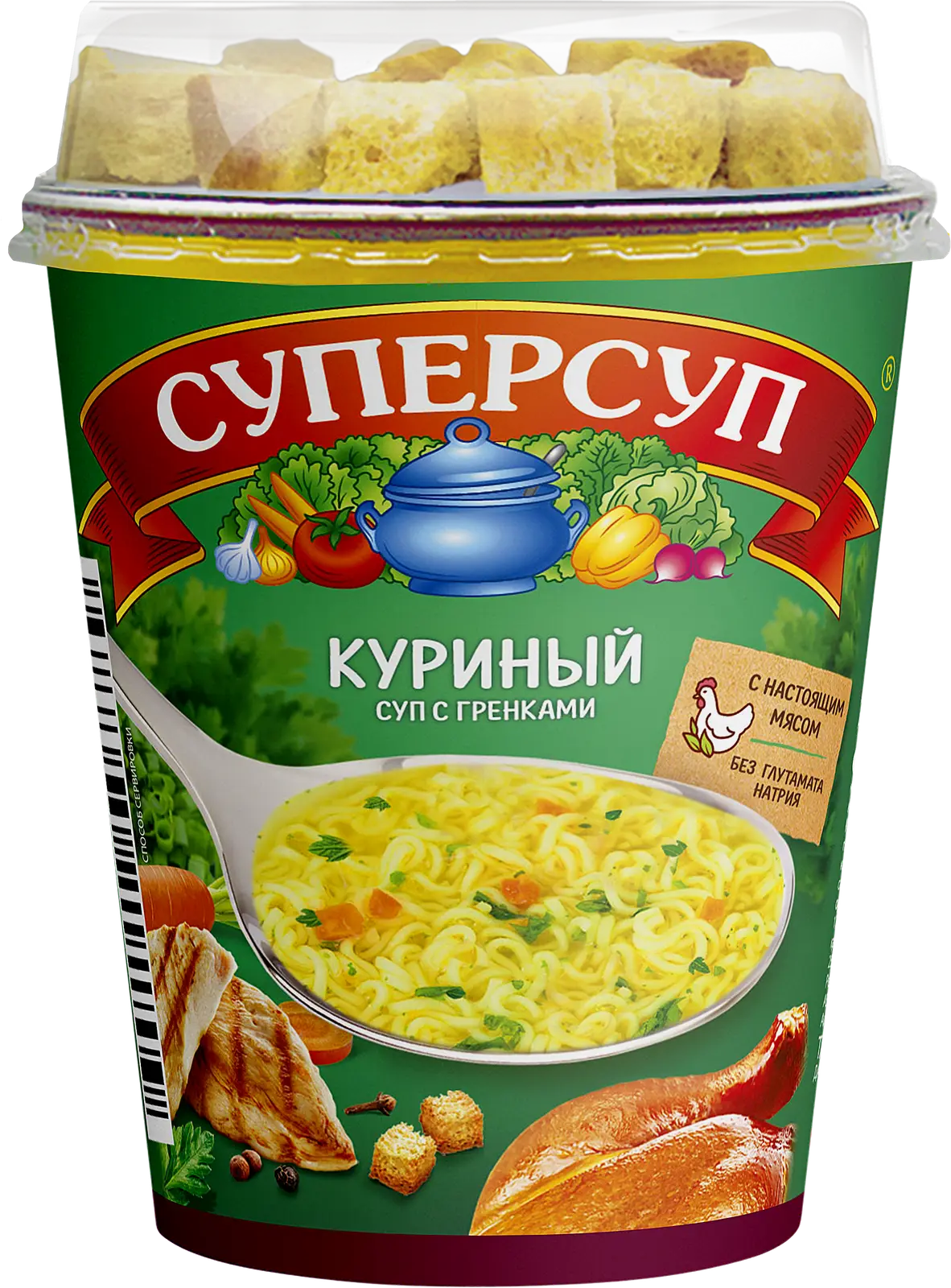 Суп Суперсуп Куриный + гренки 40г — питательный продукт быстрого приготовления, который экономит время и позволяет перекусить в дороге или офисе. Он приготовлен на основе лапши, растительных масел, дрожжей, сушеных овощей и зелени. Ароматный вкус ему придает смесь из моркови, петрушки, паприки и чеснока. В качестве начинки производитель использует порошок куриного мяса, безопасный для здоровья и пищеварения. При умеренном употреблении продукт не вызывает проблем с лишним весом.Суп поставляется в удобном для хранения пластиковом стакане. Его содержимое заливается кипятком или бульоном, настаивается до 5 минут, употребляется с тостами или зеленым луком. Срок годности продукта составляет 12 месяцев.