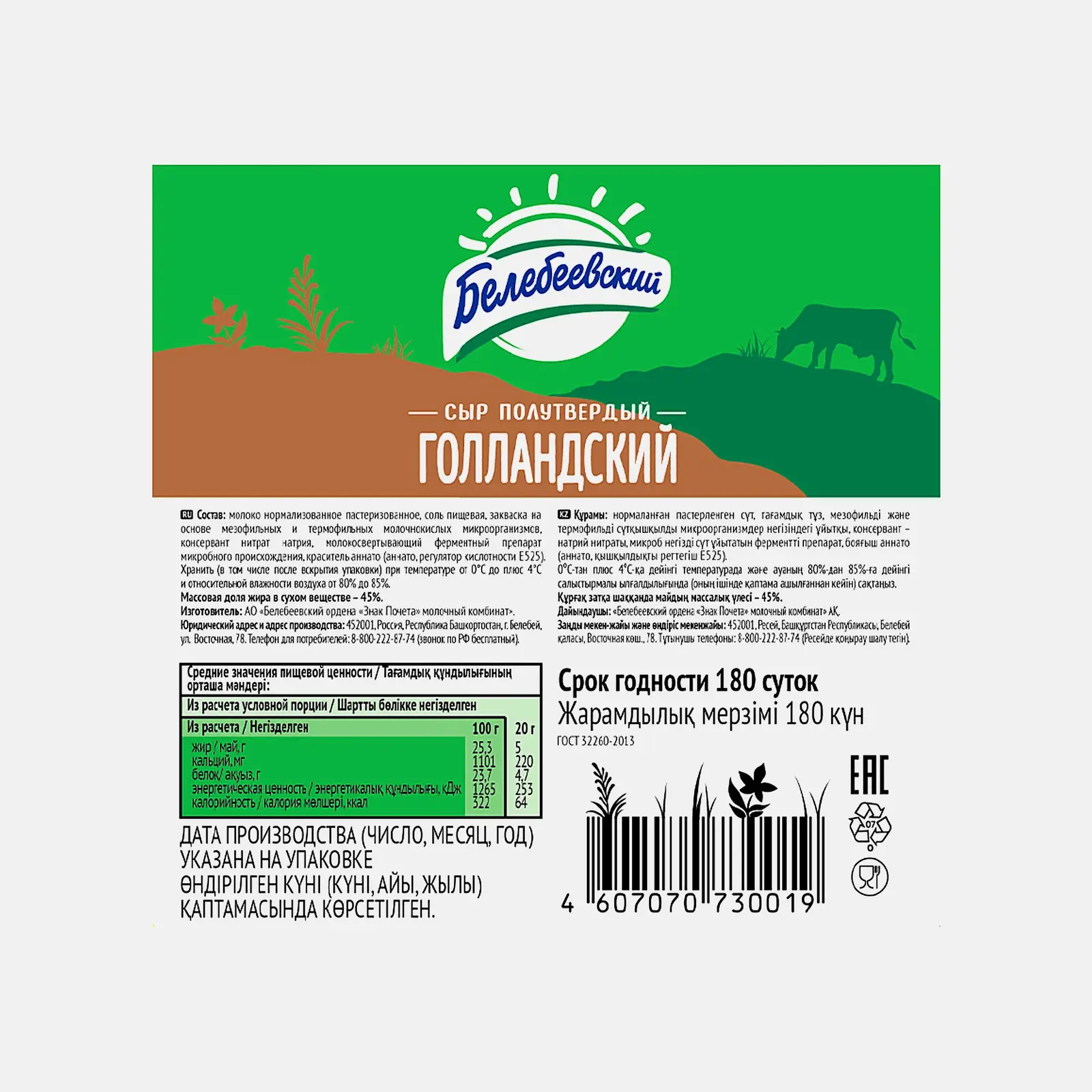 Сыр Белебеевский МК Голландский 45% — один из самых популярных продуктов. Готовят его по традиционной технологии, которая неизменна уже свыше 150 лет. Сыр отличается натуральным составом и насыщенным, немного кисловатым вкусом. Консистенция плотная и однородная. Иногда на разрезе просматриваются мелкие глазки. Аромат ярко выраженный, «сырный». Сыр Голландский используется для приготовления горячих и холодных бутербродов, салатов, соусов и заправок к мясу или рыбе. Также его добавляют в некоторые сладкие десерты. Продукт очень питательный (в 100 г 352 ккал), поэтому надолго утоляет голод.