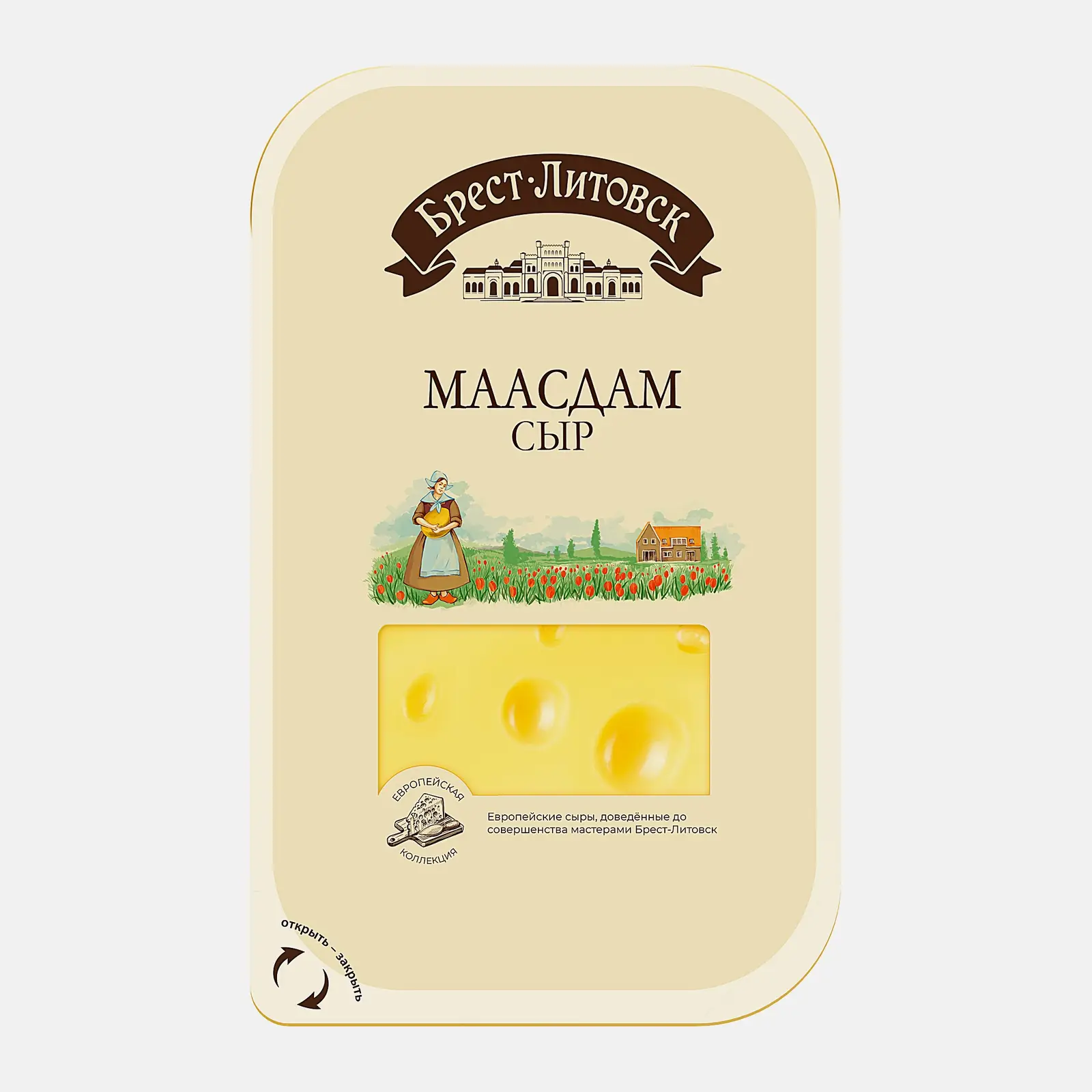 Полутвёрдый сыр изготовлен из пастеризованного коровьего молока с добавлением закваски и ферментов. Он отличается характерным сладковатым вкусом с лёгким ореховым послевкусием и нежным сливочным ароматом. У сыра гладкая текстура с крупными «глазками».