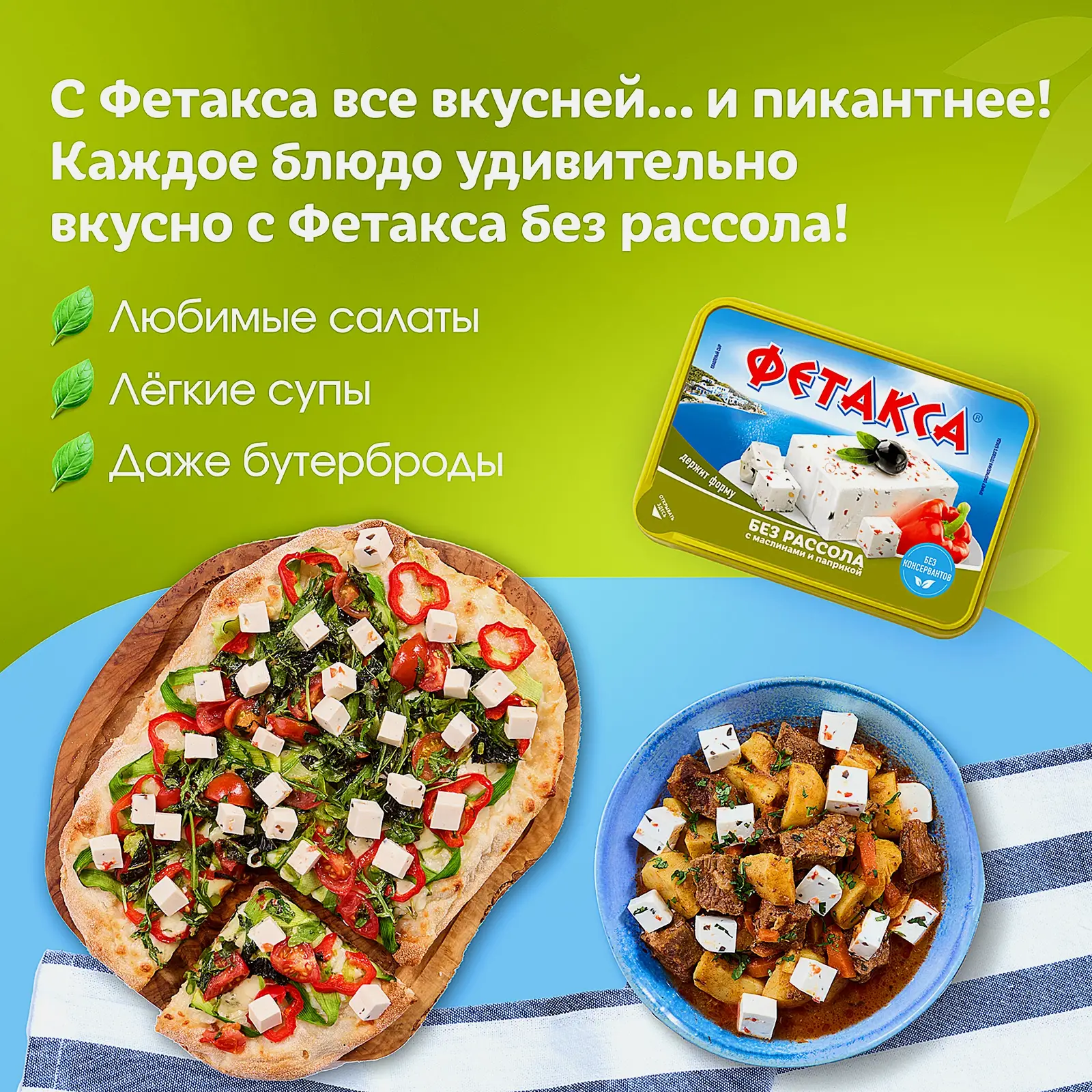 Плавленый сыр в стиле феты с маслинами и паприкой для пикантного вкуса. Упругая текстура легко нарезается кубиками. Подходит для салатов, закусок и запеканок. Без рассола.