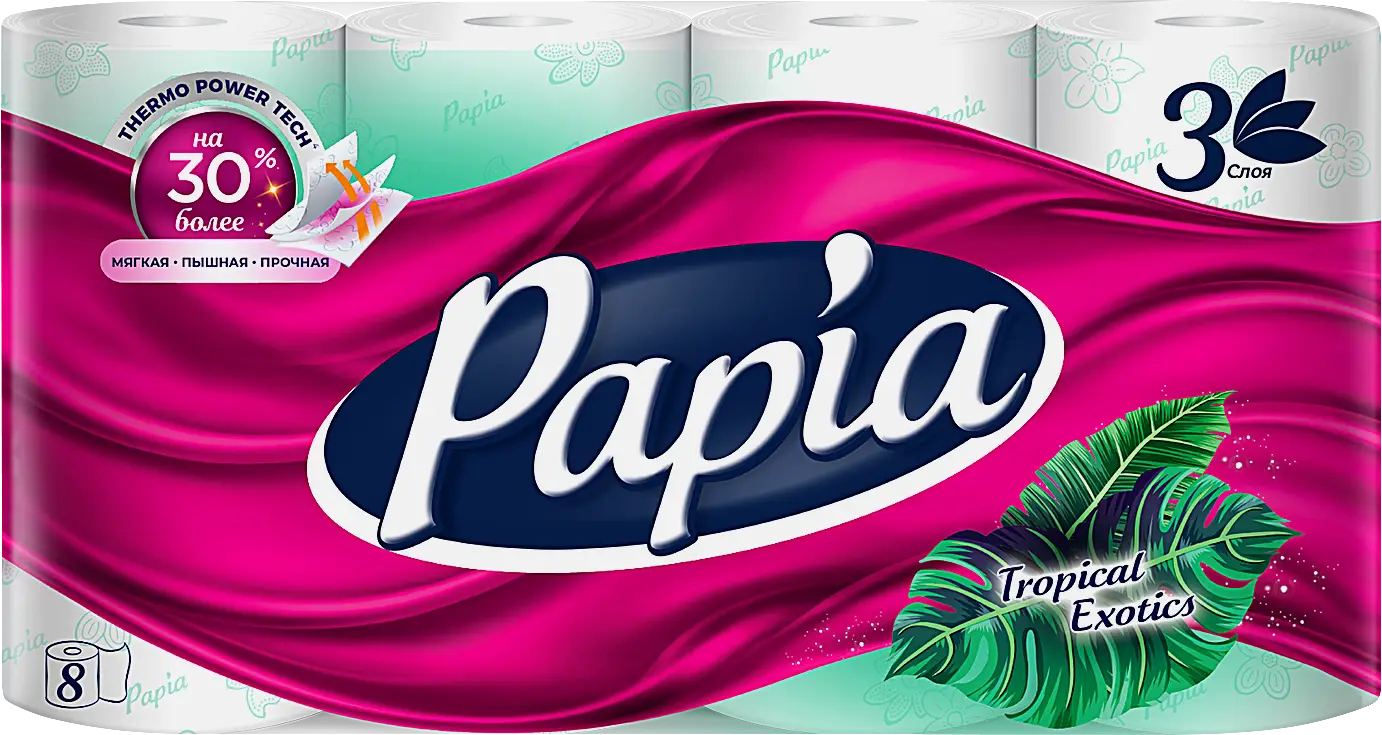 Трёхслойная парфюмированная туалетная бумага Papia из 100% целлюлозы. За счёт экстракта хлопка в составе бумага подходит для чувствительной кожи. Технология Thermo Power Tech обеспечивает на 30% больше мягкости, пышности и прочности. Бумага не расслаивается, а длина легко регулируется по перфорации.