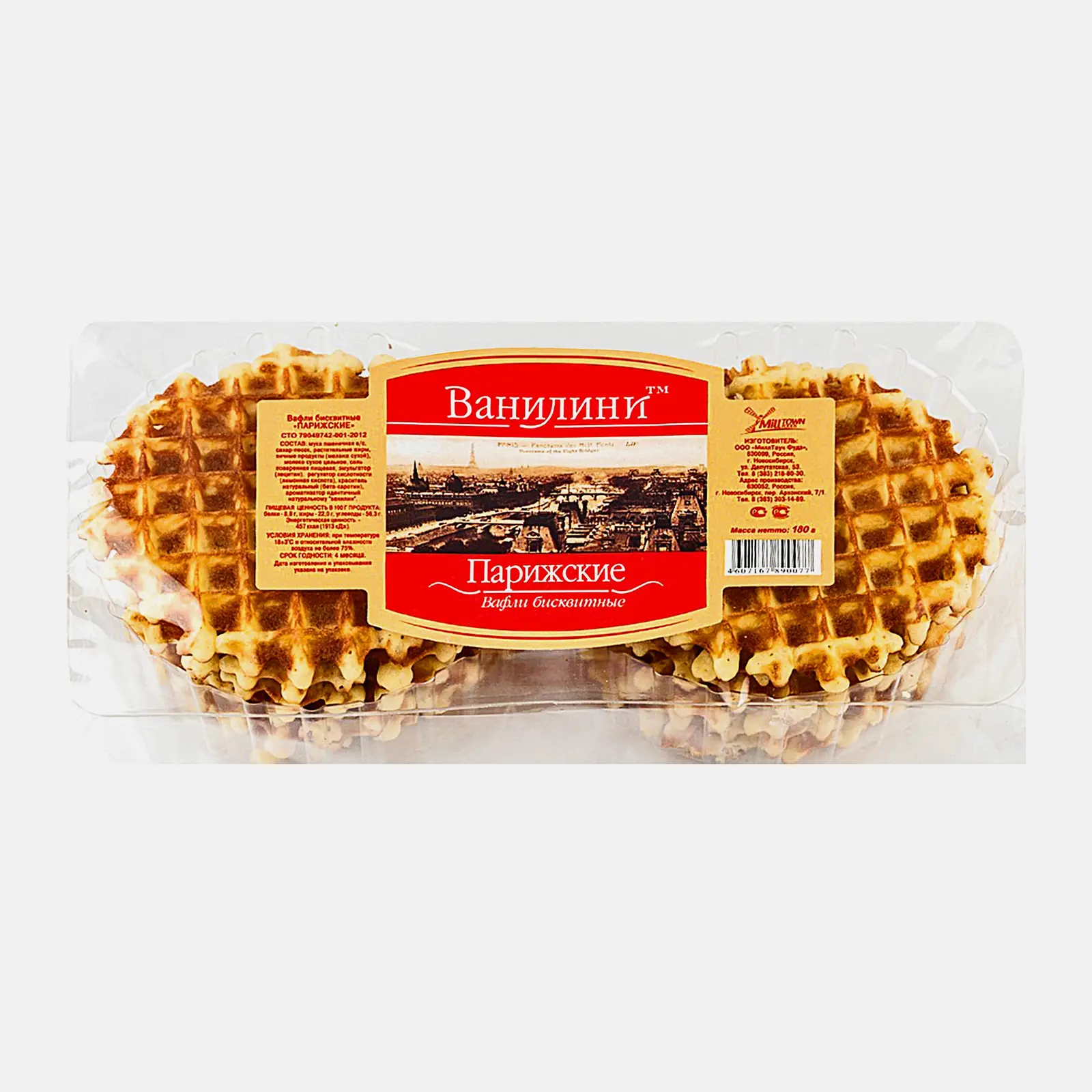 Вафли Ванилини домашние Парижские 180г — кондитерское изделие, изготовленное из бисквитного теста по традиционному рецепту. Круглые мягкие вафли отлично подойдут в качестве десерта к кофе или чаю. Их можно употреблять без начинки, а можно изготовить мини-пирожное. Для начинки подойдет любой кондитерский крем, сгущенное молоко, взбитые сливки. Их можно намазывать джемом или медом. Такое лакомство оценят и взрослые, и дети. Вафли выпускаются в пластиковом контейнере, разделенном на два отсека, в каждом по 6 штук. Их удобно взять с собой на работу, в дорогу или на дачу.