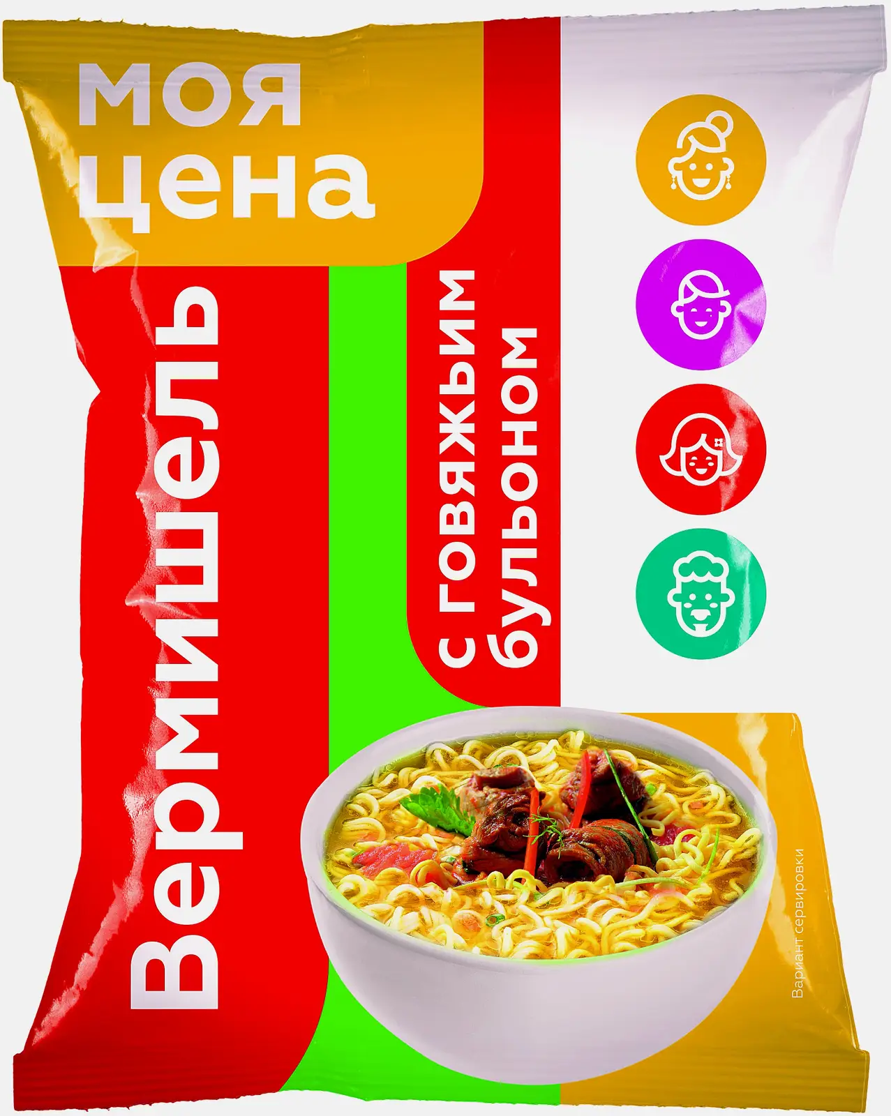 Вермишель Моя цена Говяжий бульон 60г — качественный и сытный продукт, который удобно хранить и быстро готовить. Вермишель не крошится, не рассыпается и хорошо сохраняет форму. У неё насыщенный, нежный вкус и приятный аромат сочной говядины. У вермишели надëжная упаковка, которая обеспечивает её свежесть на длительное время. Идеально подойдëт для быстрого и сытного перекуса на работе или в дороге. Перед употреблением достаточно просто залить вермишель кипятком, добавить пикантные специи из набора и дать настояться несколько минут.