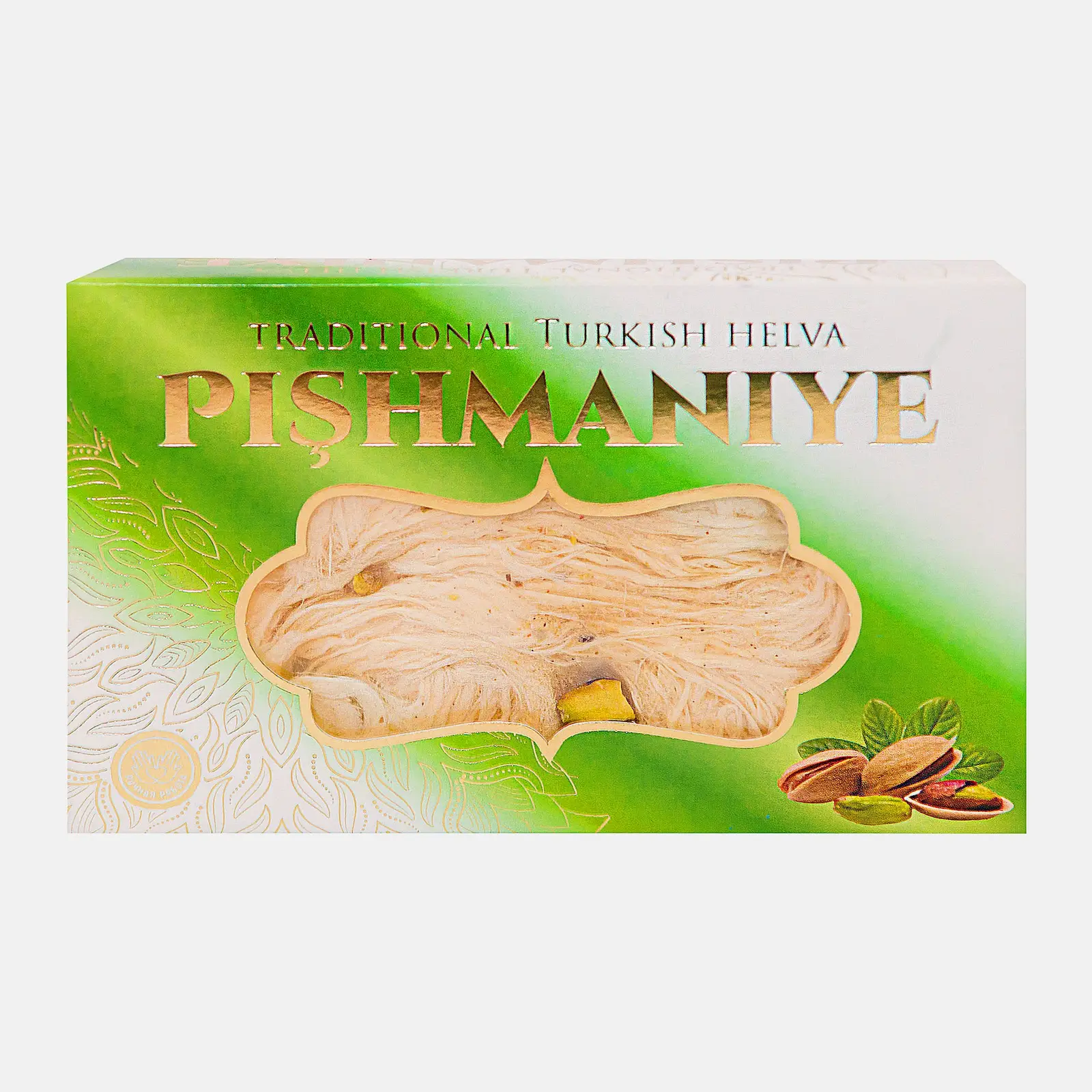 Это разновидность халвы, которая делается не как привычная нам — на кунжуте и мыльном корне — а на пшеничной муке. Получаются очень тонкие и тающие во рту нити в сочетании с настоящими фисташками.