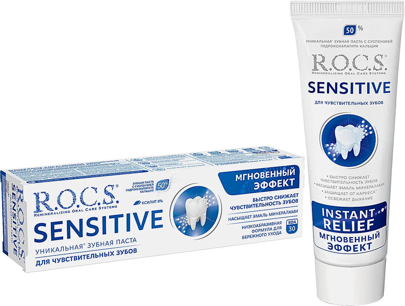 Зубная паста R.O.C.S. Sensitive «Мгновенный эффект» для ухода за чувствительными зубами. Формула с гидроксиапатитом кальция снижает чувствительность, укрепляет зубы и бережно очищает эмаль, помогая сохранить естественную белизну улыбки.