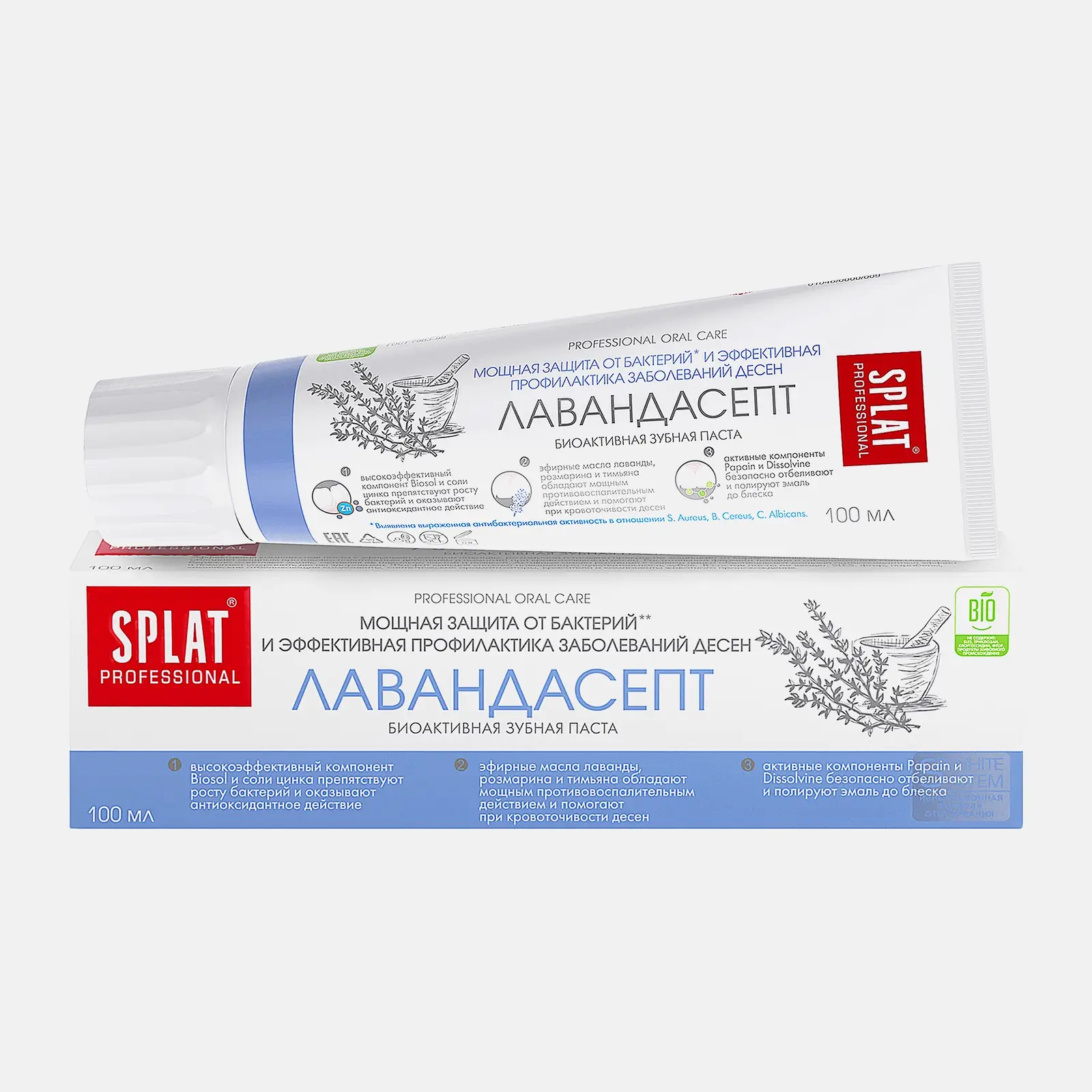 Зубная паста с эфирными маслами лаванды, розмарина и тимьяна эффективно защищает от бактерий, предотвращает воспаление и кровоточивость дёсен. Папаин и соли Dissolvinе мягко отбеливают эмаль, а соли цинка и фосфат кальция укрепляют дёсны и снижают чувствительность. Без фтора и химических добавок.