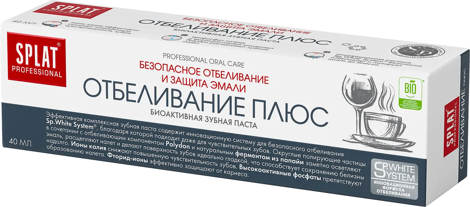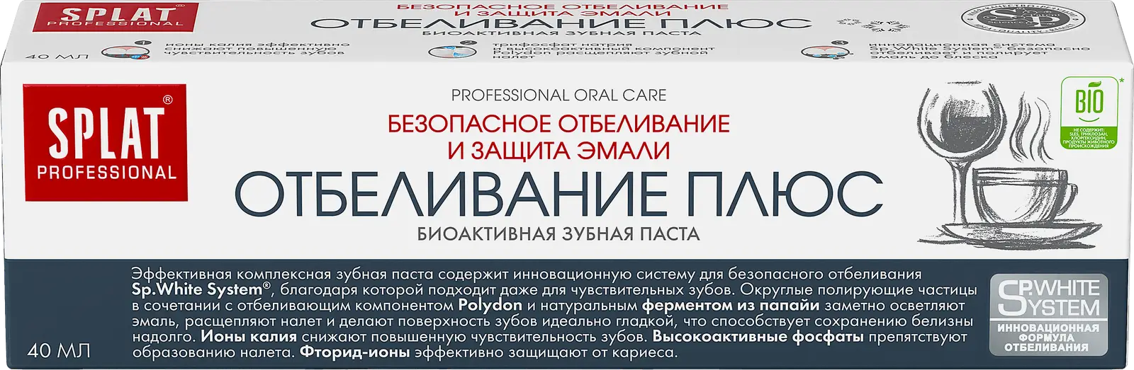 Зубная паста тщательно удаляет налёт, расщепляя его, за счёт чего эмаль становится заметно светлее. Ионы калия, входящие в состав, помогают минимизировать повышенную чувствительность зубов.