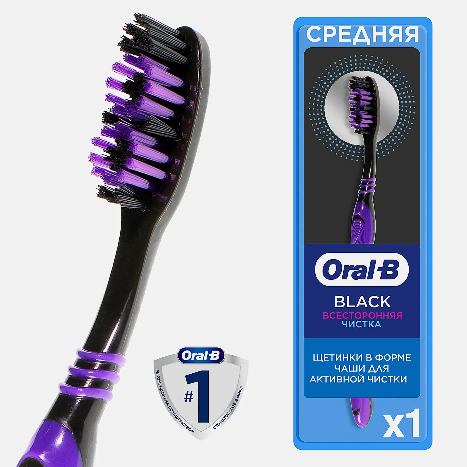 Зубная щётка средней жёсткости с щетинками в форме чаши для эффективного очищения межзубного пространства и линии дёсен. С обратной стороны щётки есть подушечка для чистки языка и щёк. Эргономичная ручка комфортно лежит в руке и не выскальзывает. Цвет в ассортименте.