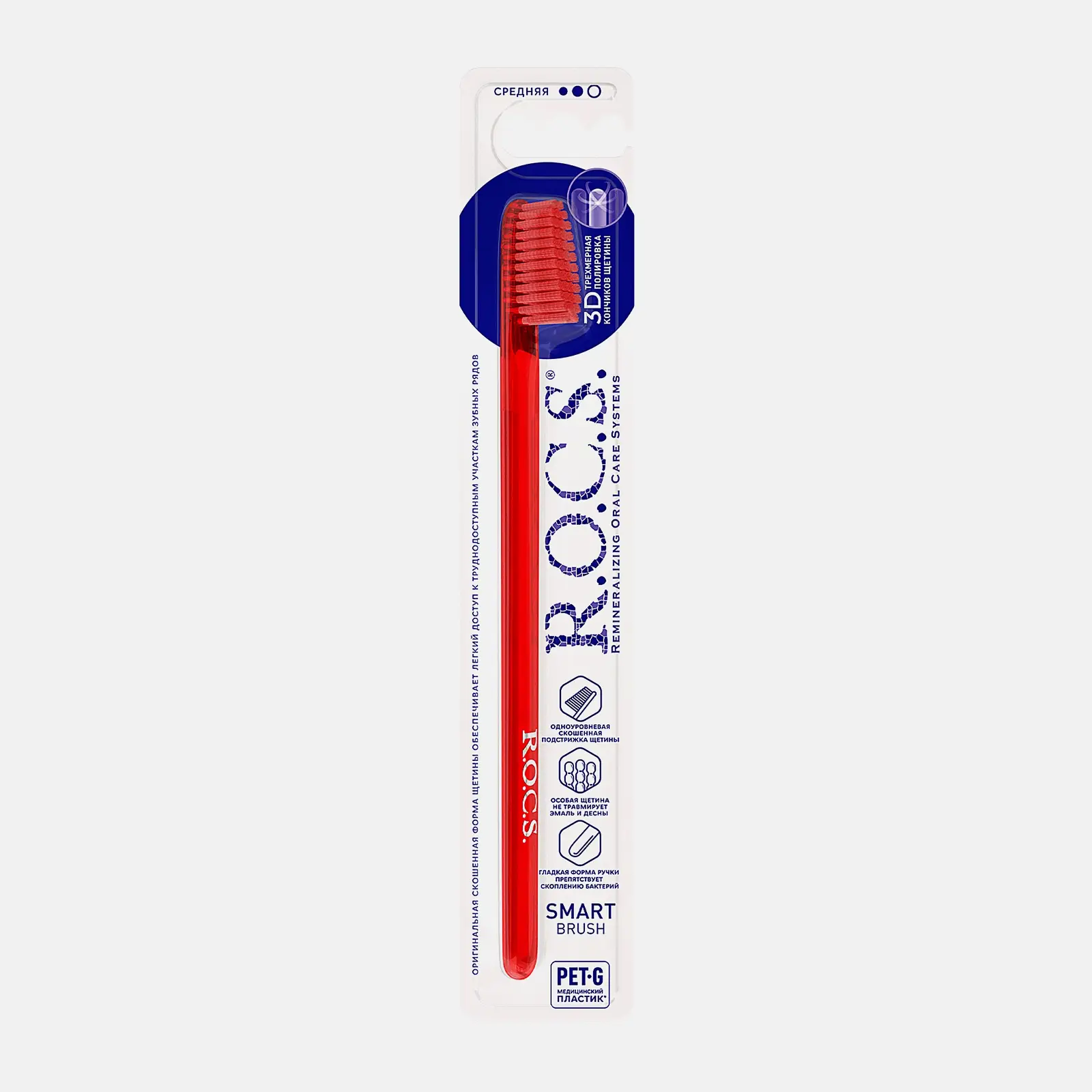 Зубная щетка R. O. C. S. «Классическая», Средняя — продукт, который привлекает внимание оригинальным дизайном и хорошим функционалом. Форма щетки повторяет анатомические изгибы зубного ряда (слегка скошенная). Благодаря этому она эффективно очищает зубы со всех сторон. Тонкая ручка удобно лежит в ладони и предотвращает чрезмерное давление на десны. Высококачественная текстурированная щетина оказывает легкий массажный эффект и не травмирует пародонтальные ткани. Ее кончики гладкие и закругленные, поэтому хорошо полируют эмаль, осветляют ее и придают блеск. Применение: смочите ворс водой и выдавите из тюбика пасту. Очистите внешнюю и внутреннюю поверхность зубов, языка и десен. Прополощите рот водой.
