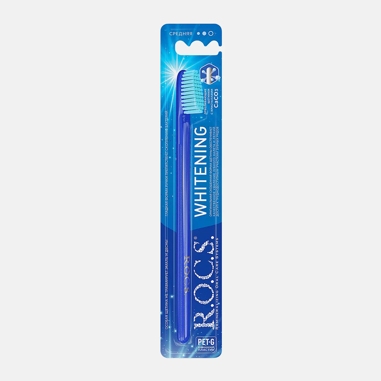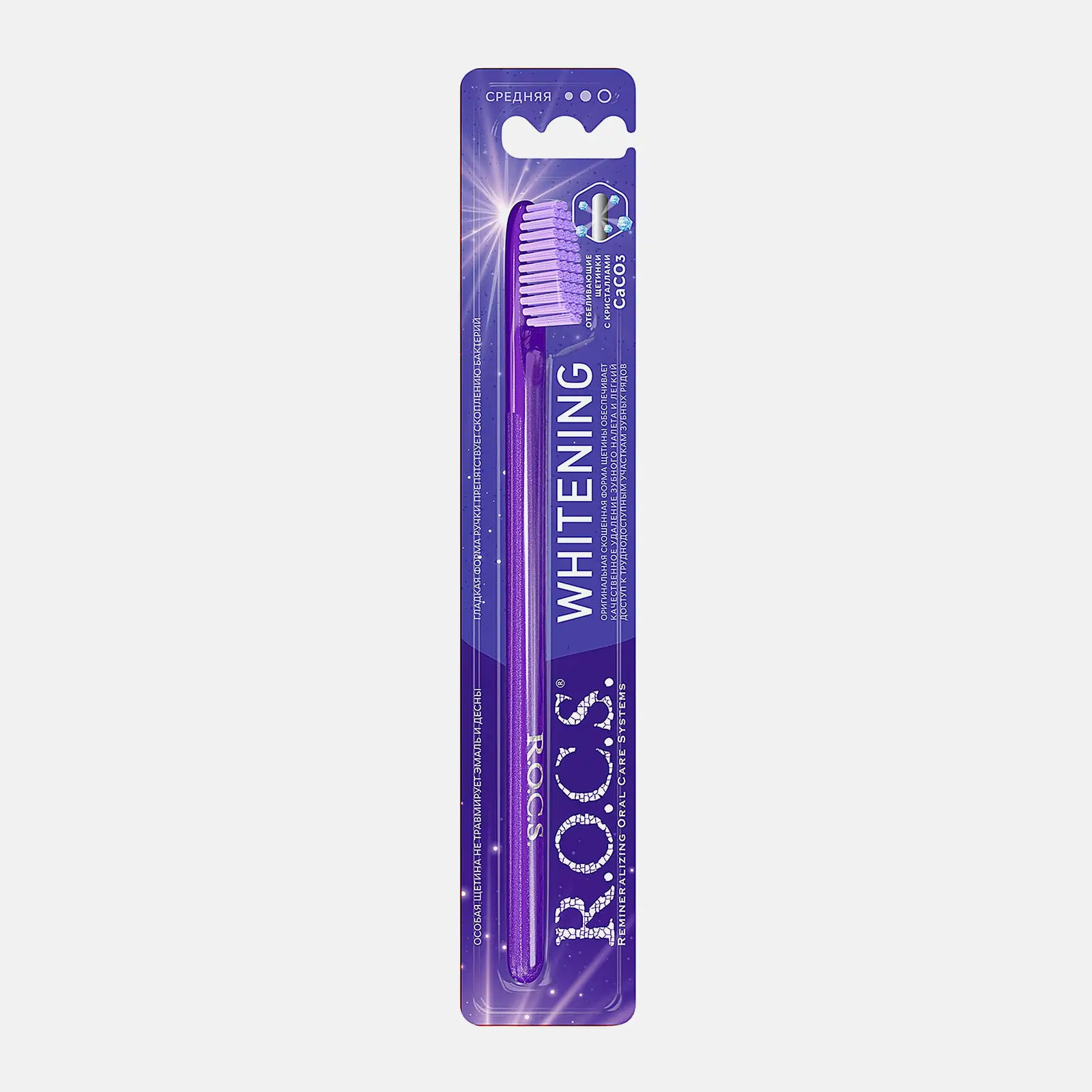 Зубная щетка отбеливающая R. O. C. S. Средняя жесткость — незаменимая помощница для тех, кто внимательно относится к здоровью зубов и десен. В комплексе с зубным порошком щетка хорошо справляется с зубным налетом и патогенными микроорганизмами. При регулярном применении она делает зубную эмаль светлее на несколько тонов. Щетина подстрижена по всей длине одинаково. Это увеличивает рабочую площадь и обеспечивает максимальный контакт с зубами. В составе волокон содержится карбонат кальция — вещество, которое препятствует кариозному разрушению твердых тканей. Эргономичная ручка гарантирует хорошую маневренность во время применения. Щетка удобно лежит в ладони и не выскальзывает из рук.