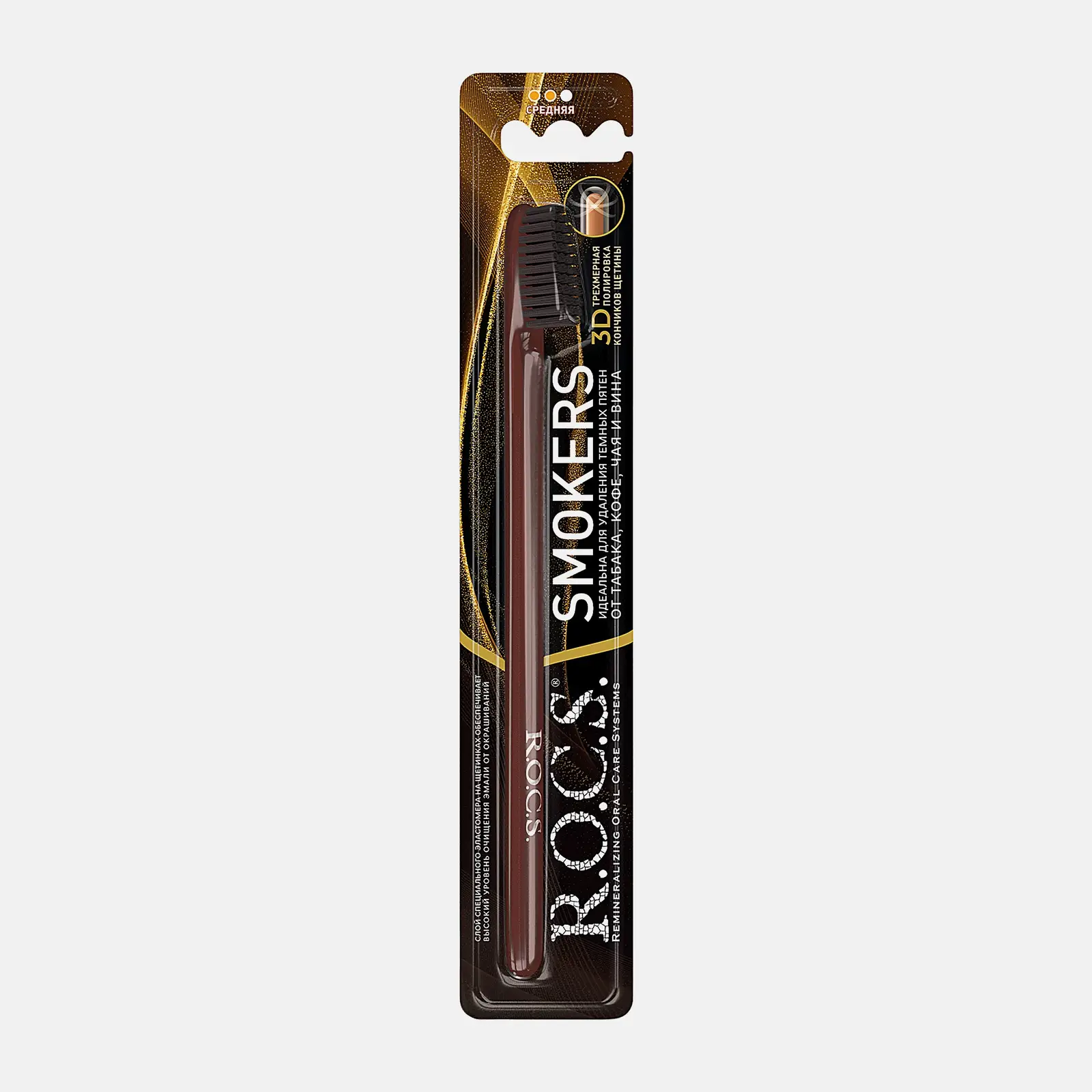 Зубная щётка средней жёсткости с двухкомпонентной щетиной эффективно удаляет пигментированный налёт от кофе, чая, вина и табака. Тонкая сердцевина придаёт упругость, а мягкое покрытие усиливает очищение. Полированные кончики щетинок защищают эмаль и дёсны.