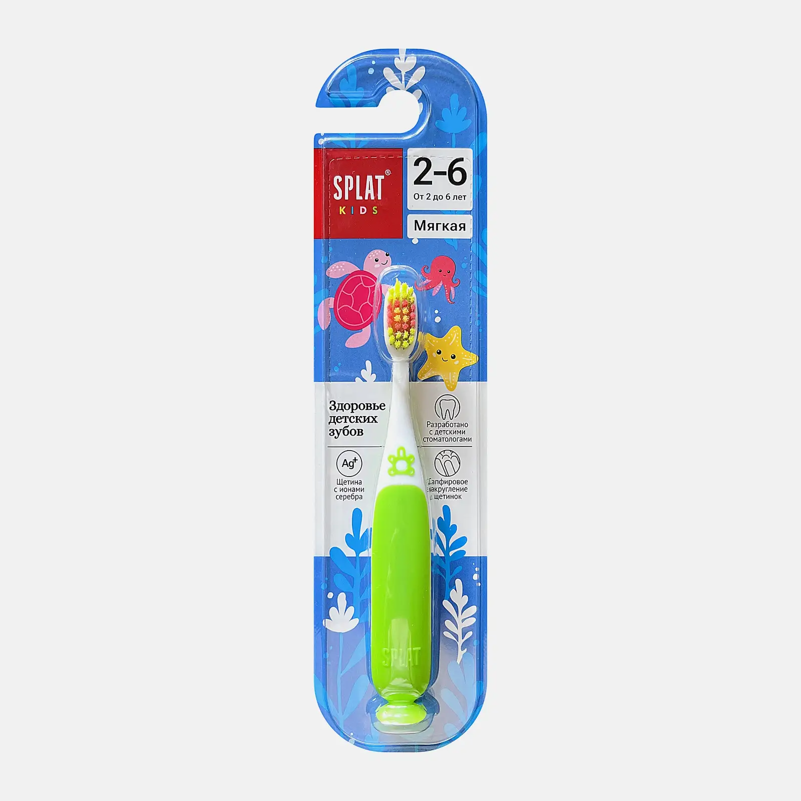 Мягкая зубная щётка для детей 2-8 лет с ионами серебра. Тонкие нейлоновые щетинки очищают налёт, проникая в труднодоступные места. Благодаря инновационному сапфировому скруглению кончиков щетина бережно воздействует на детскую эмаль и дёсны. Прорезиненная ручка не скользит, щётка крепится на присоске.